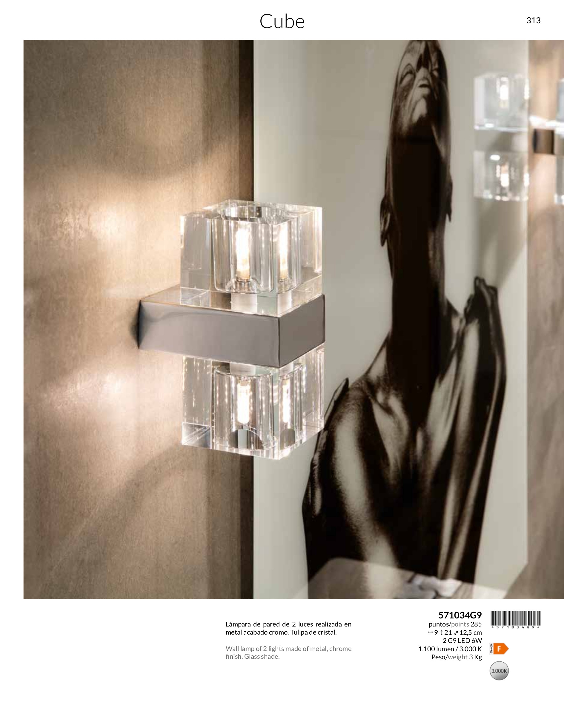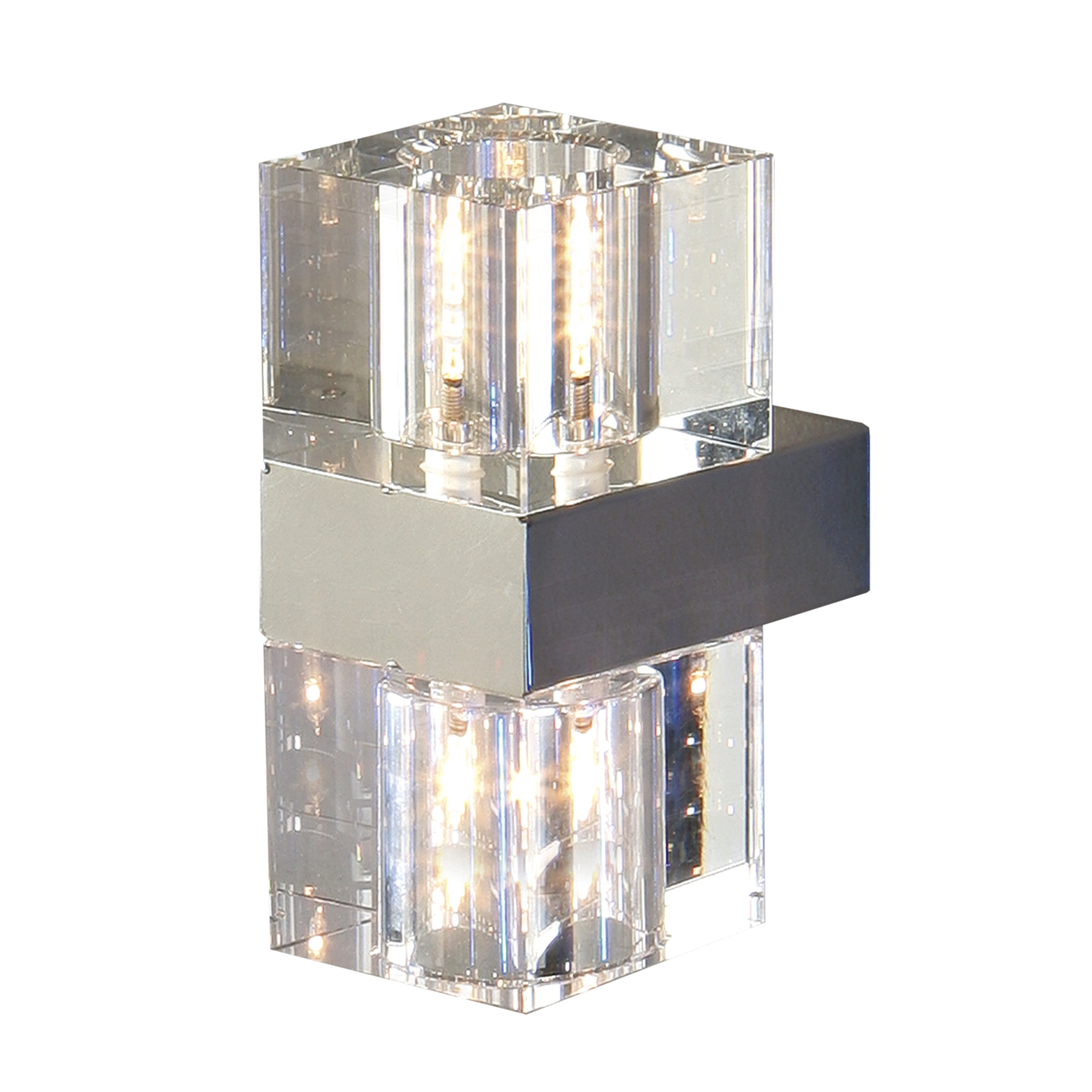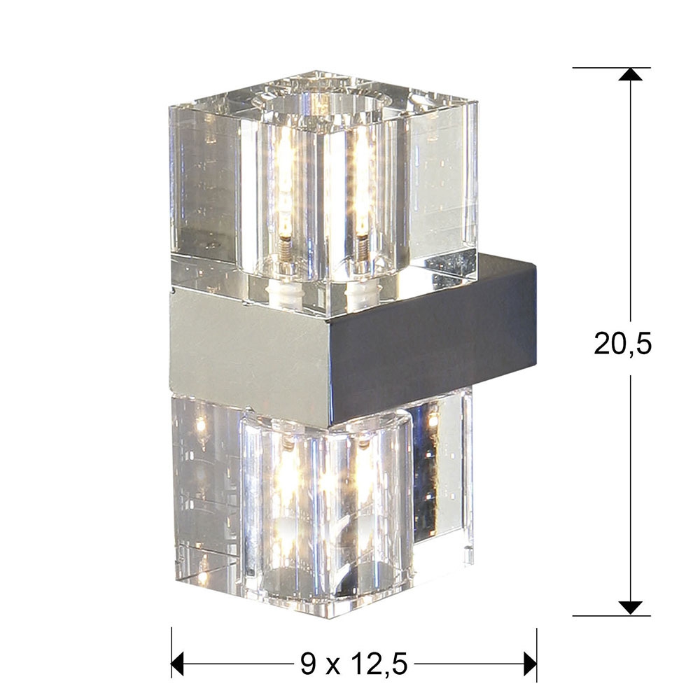 Осветителното тяло 571034G9 CUBIC WALL LAMP, 2L. G9 ще осигури комфорт и естетика във всяко помещение, в което се постави. Цялостната визия и дизайн на лампата и вложените в изработката й материали, като хромиран метал, масивно прозрачно стъкло, ще допринесат за един неповторим стил. Благодарение на дългогодишния опит, качествените материали и строгия контрол на качеството на изработка на производителя Schuller (Испания), 571034G9 CUBIC WALL LAMP, 2L. G9 е на високо европейско ниво.