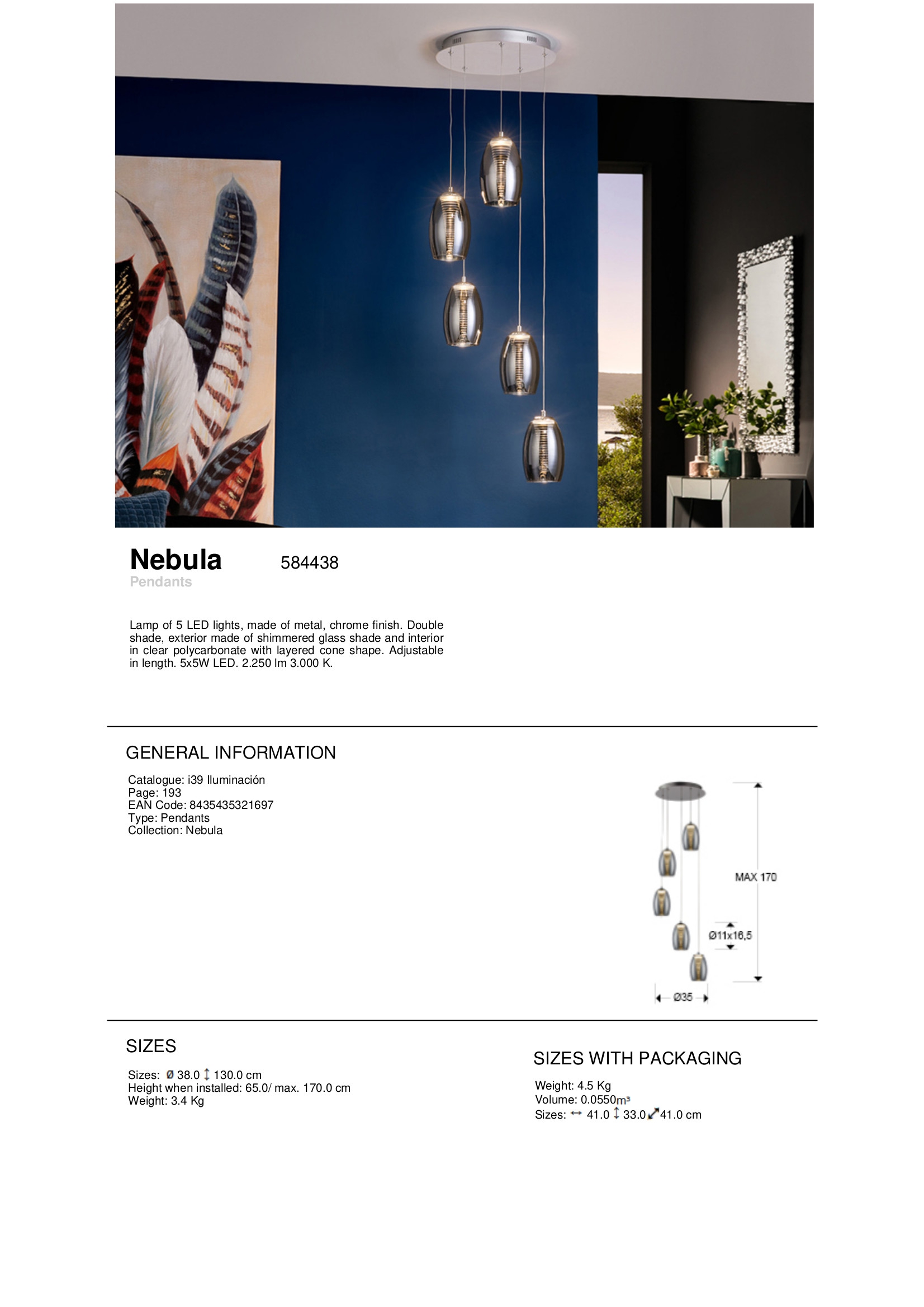 Осветителното тяло 584438D NEBULA DIMMABLE LED LAMP 5L.DIMMABLE. представлява лед полилей в съвременен стил. 584438D NEBULA DIMMABLE LED LAMP 5L.DIMMABLE. е от категорията и е подходящо за осветяване на различни помещения и пространства като: всекидневна / хол, спалня, кухня, трапезария, офис.