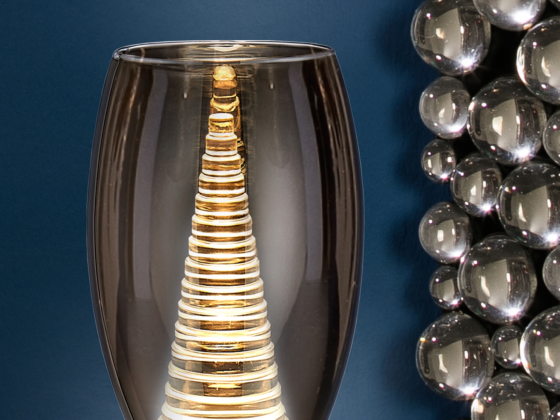 хромиран метал, двоен абажур, външна част от прозрачно блестящо стъкло, вътрешна част от прозрачен поликарбонат с наслоен конус