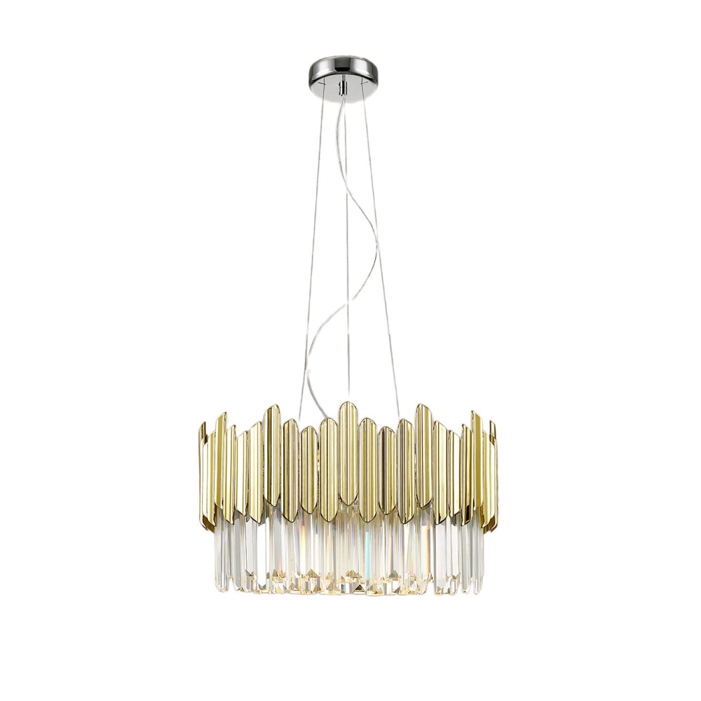 хромиран метал, фасетирани стъклени призми и призми с покритие в цвят злато от полимер (ABS)