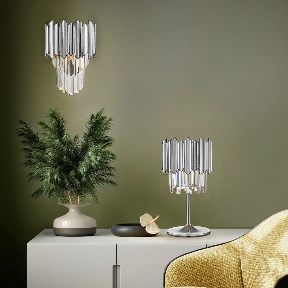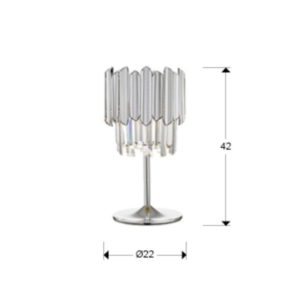 Лед настолна лампа 605274 TIARA- TABLE LAMP 1L CHROME ще осигури комфорт и естетика във всяко помещение, в което се постави. Цялостната визия и дизайн на led лампата и вложените в изработката й материали, като хромиран метал, фасетирани стъклени призми и призми с покритие в цвят хром от полимер (ABS), ще допринесат за един неповторим стил. Благодарение на дългогодишния опит в производството на лед осветление, качествените материали и строгия контрол на качеството на изработка на производителя Schuller (Испания), 605274 TIARA- TABLE LAMP 1L CHROME е на високо европейско ниво.