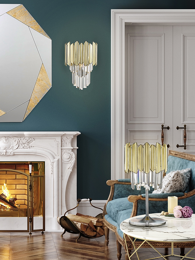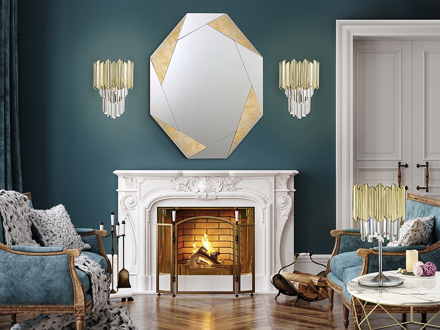 хромиран метал, фасетирани стъклени призми и призми с покритие в цвят злато от полимер (ABS)