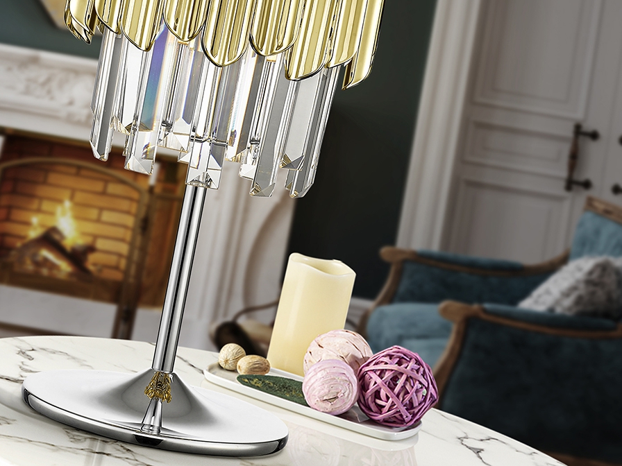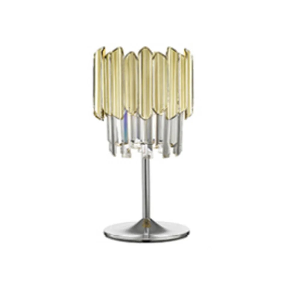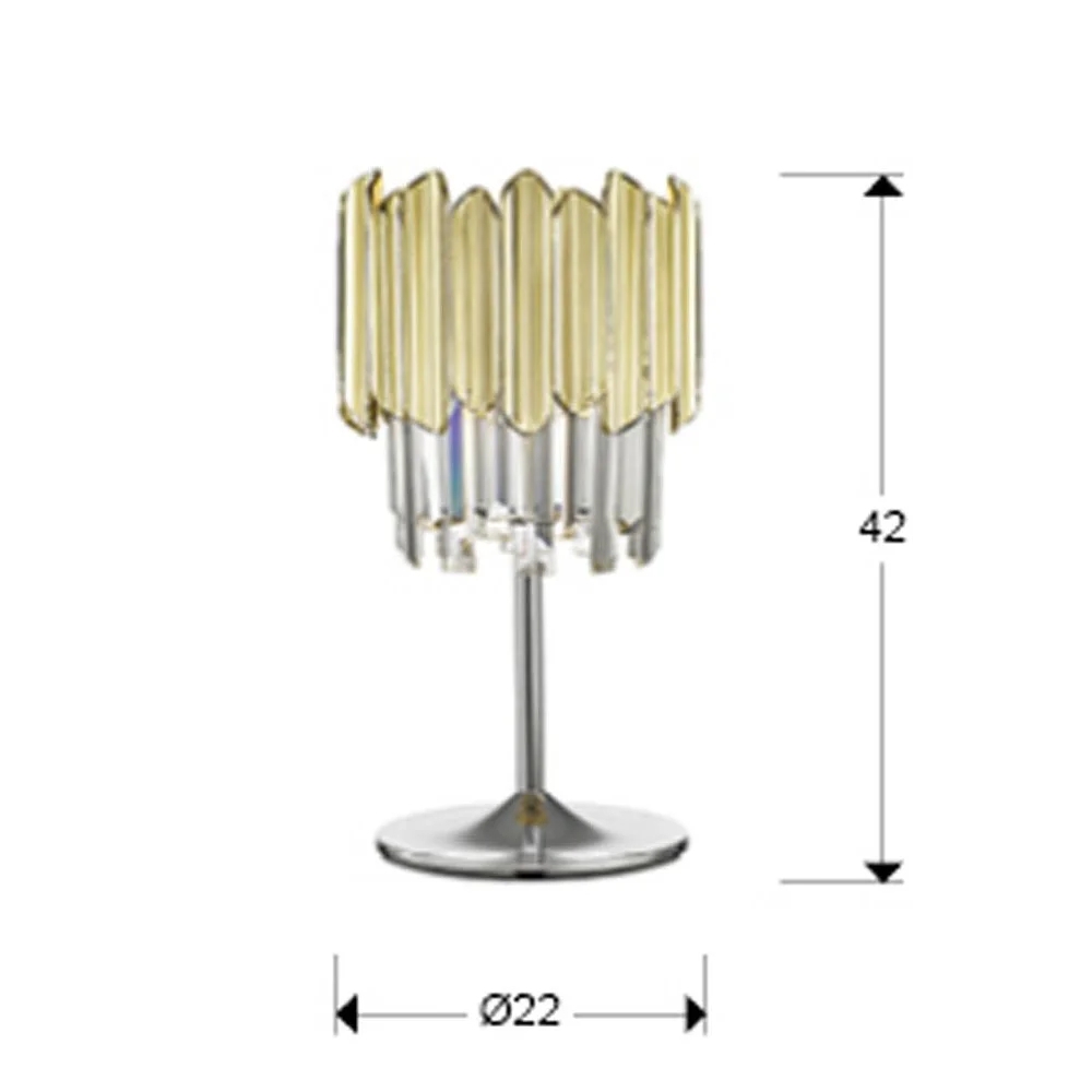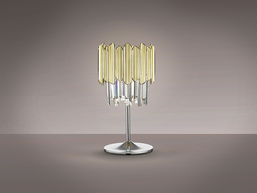 Осветителното тяло 605281 TIARA- TABLE LAMP 1L CHROME-GOLD ще осигури комфорт и естетика във всяко помещение, в което се постави. Цялостната визия и дизайн на лампата и вложените в изработката й материали, като хромиран метал, фасетирани стъклени призми и призми с покритие в цвят злато от полимер (ABS), ще допринесат за един неповторим стил. Благодарение на дългогодишния опит, качествените материали и строгия контрол на качеството на изработка на производителя Schuller (Испания), 605281 TIARA- TABLE LAMP 1L CHROME-GOLD е на високо европейско ниво.