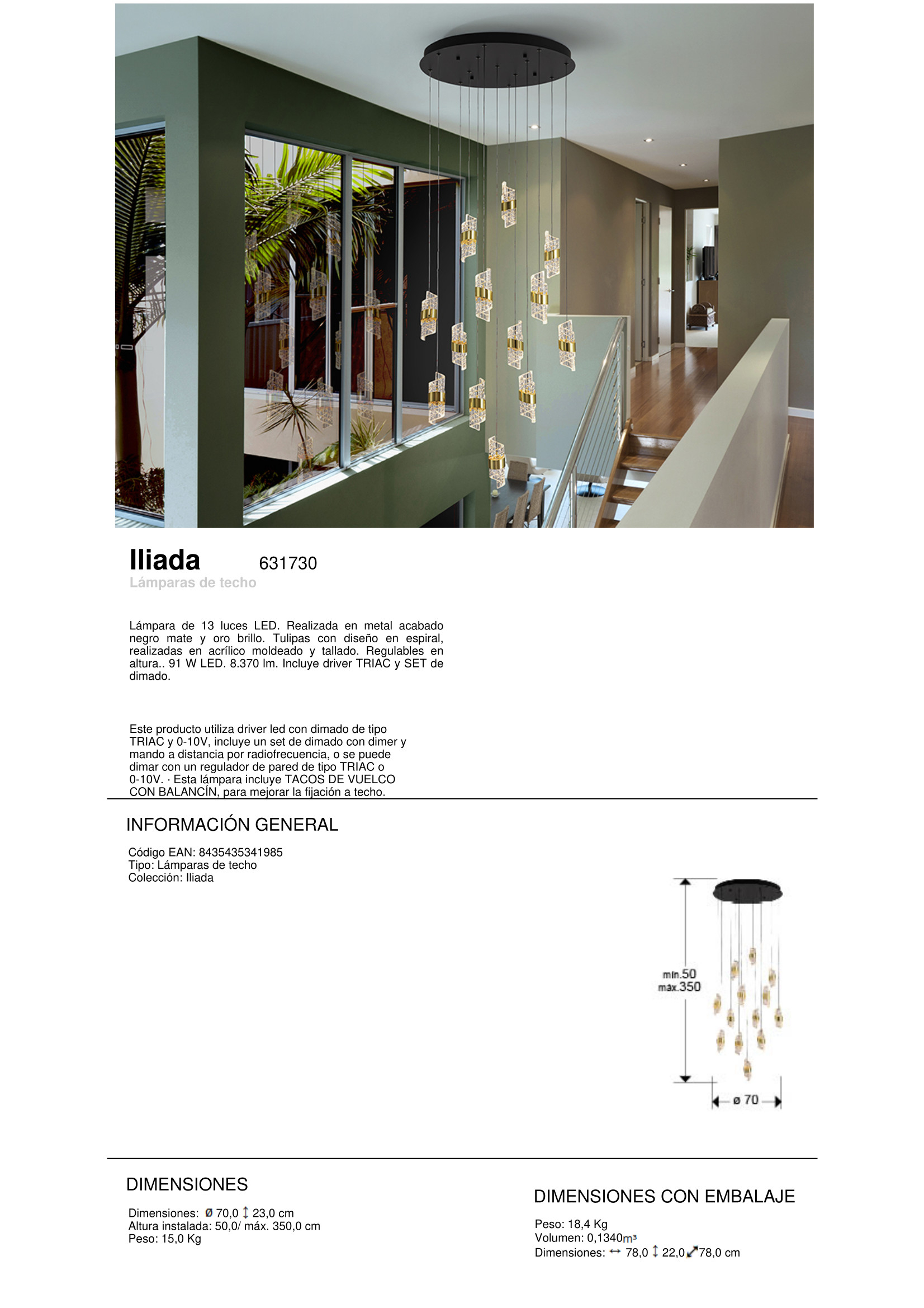 Осветителното тяло 631730 ILIADA - LAMP 13L BLACK-GOLD D70 ще осигури комфорт и естетика във всяко помещение, в което се постави. Цялостната визия и дизайн на лампата и вложените в изработката й материали, като метал в матово черен цвят, златисти метални орнаменти, спираловиден лят и резбован акрил, включва комплект за димиране, ще допринесат за един неповторим стил. Благодарение на дългогодишния опит, качествените материали и строгия контрол на качеството на изработка на производителя Schuller (Испания), 631730 ILIADA - LAMP 13L BLACK-GOLD D70 е на високо европейско ниво.