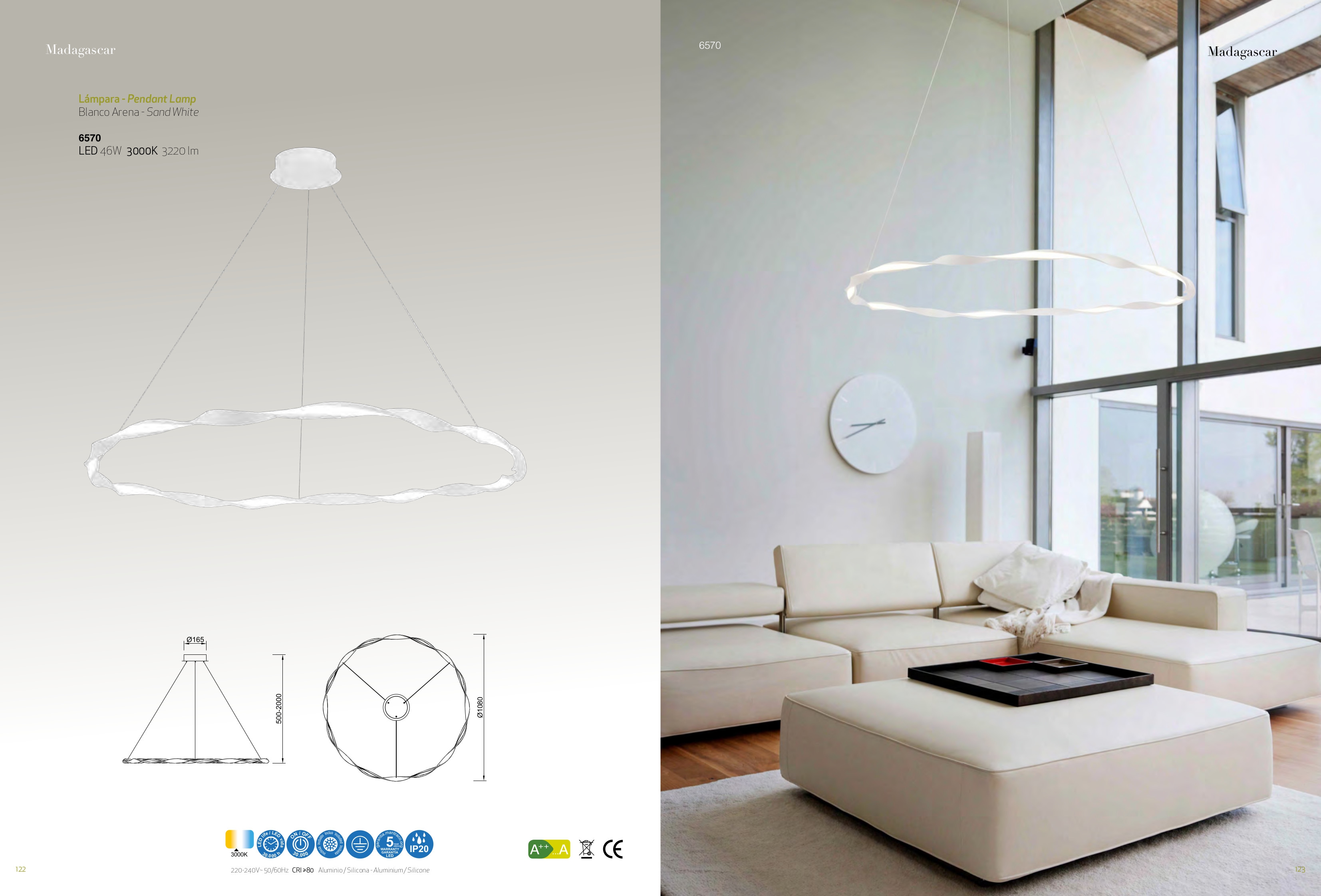 Осветителното тяло ^6570 PENDANT LED 46W/3000K SAND WHITE ще осигури комфорт и естетика във всяко помещение, в което се постави. Цялостната визия и дизайн на лампата и вложените в изработката й материали, като алуминий в пясъчно бял цвят, силикон в бяло, ще допринесат за един неповторим стил. Благодарение на дългогодишния опит, качествените материали и строгия контрол на качеството на изработка на производителя Mantra (Испания), ^6570 PENDANT LED 46W/3000K SAND WHITE е на високо европейско ниво.