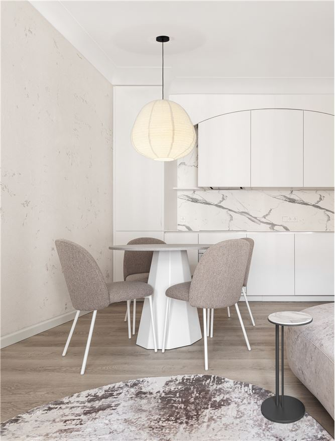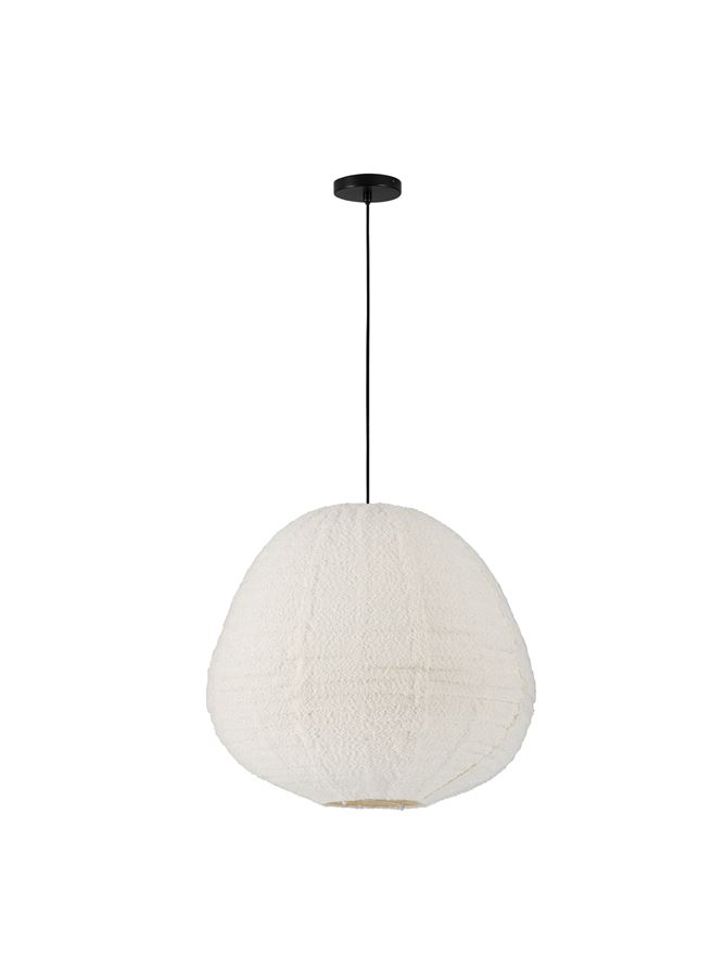 Стилът и естетиката на обстановката ще се обогатят благодарение, както на цялостната визия и дизайн на осветителното тяло, така и на вложените в изработката му, качествени материали, като: текстил тип букле в бяло.
