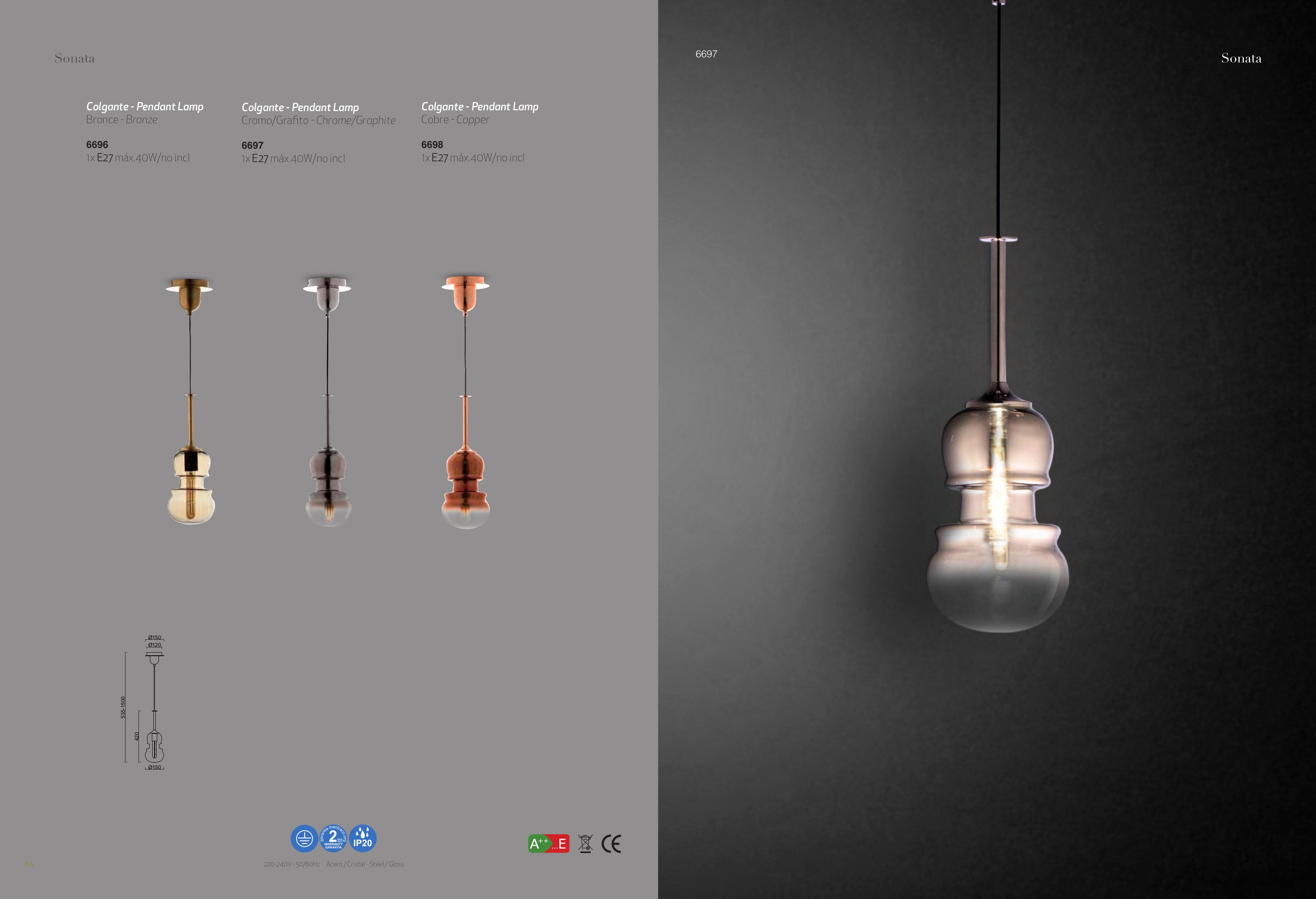 Стилът и естетиката на обстановката ще се обогатят благодарение, както на цялостната визия и дизайн на осветителното тяло, така и на вложените в изработката му, качествени материали, като: стомана в цвят хром/графит, опушено стъкло в цвят опалово сиво.