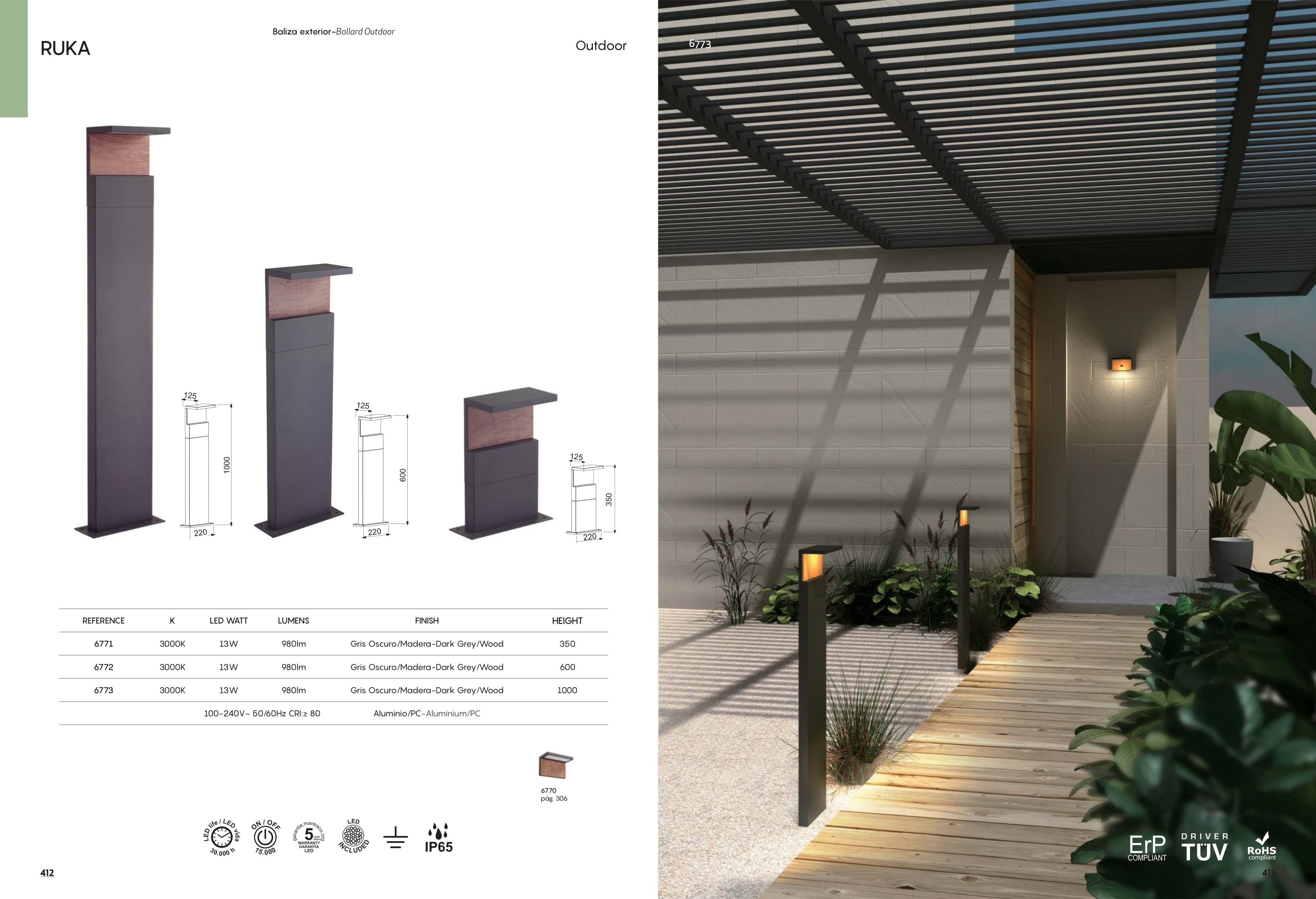 Осветителното тяло 6773 Dark Grey 13W 3000K 980lm RUKA ще осигури комфорт и естетика във всяко помещение, в което се постави. Цялостната визия и дизайн на лампата и вложените в изработката й материали, като алуминий в тъмно сив цвят, орехово дърво, ще допринесат за един неповторим стил. Благодарение на дългогодишния опит, качествените материали и строгия контрол на качеството на изработка на производителя Mantra (Испания), 6773 Dark Grey 13W 3000K 980lm RUKA е на високо европейско ниво.