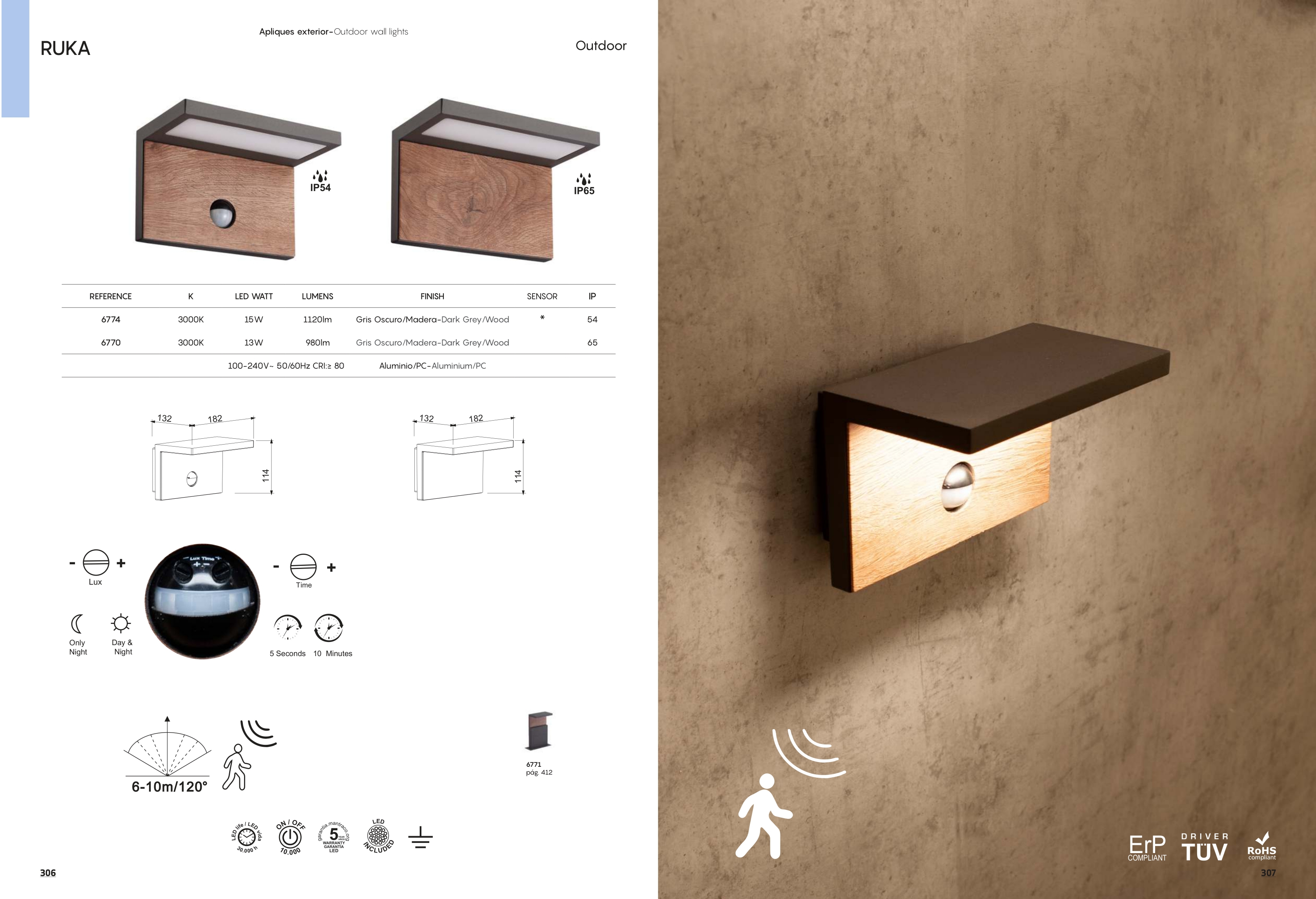 Осветителното тяло 6774 Dark Grey 15W 3000K 1120lm RUKA ще осигури комфорт и естетика във всяко помещение, в което се постави. Цялостната визия и дизайн на лампата и вложените в изработката й материали, като алуминий в тъмно сив цвят, орехово дърво, сензор за движение, ще допринесат за един неповторим стил. Благодарение на дългогодишния опит, качествените материали и строгия контрол на качеството на изработка на производителя Mantra (Испания), 6774 Dark Grey 15W 3000K 1120lm RUKA е на високо европейско ниво.