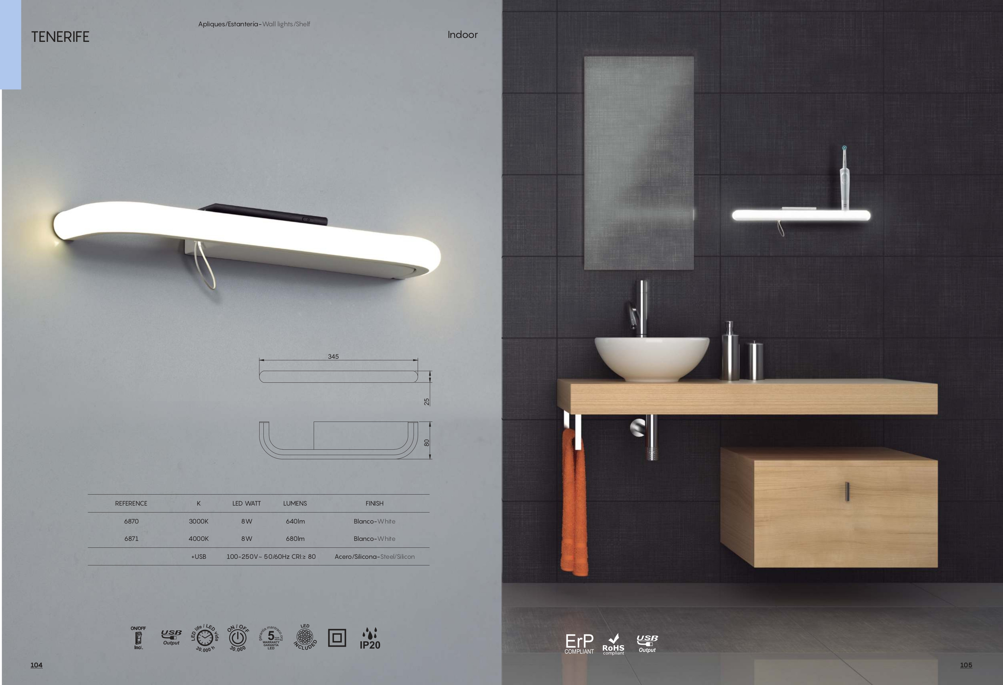 Осветителното тяло ^6870 WHITE SHELF WHITE LED 8W/3000K+USB LED 5W/30 ще осигури комфорт и естетика във всяко помещение, в което се постави. Цялостната визия и дизайн на лампата и вложените в изработката й материали, като стомана в бял цвят, силикон в бяло, ключ ON/OFF, USB порт, ще допринесат за един неповторим стил. Благодарение на дългогодишния опит, качествените материали и строгия контрол на качеството на изработка на производителя Mantra (Испания), ^6870 WHITE SHELF WHITE LED 8W/3000K+USB LED 5W/30 е на високо европейско ниво.
