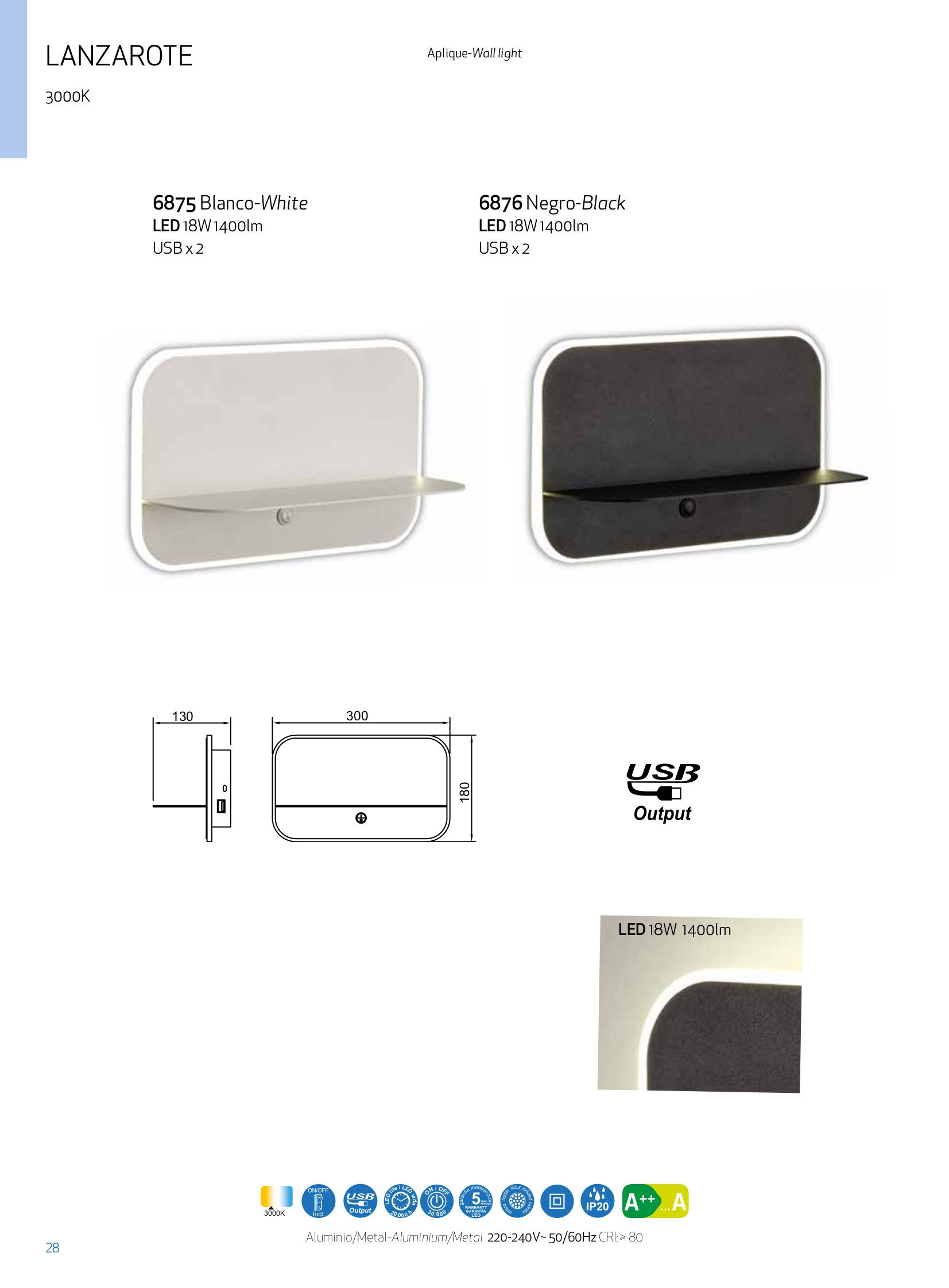 Лед аплик ^6875 WHITE WALL LAMP LED WHITE 18W/3000K+2*USB 3W ще осигури комфорт и естетика във всяко помещение, в което се постави. Цялостната визия и дизайн на led лампата и вложените в изработката й материали, като алуминий в бял цвят, интегрирани 2 бр. USB, ще допринесат за един неповторим стил. Благодарение на дългогодишния опит в производството на лед осветление, качествените материали и строгия контрол на качеството на изработка на производителя Mantra (Испания), ^6875 WHITE WALL LAMP LED WHITE 18W/3000K+2*USB 3W е на високо европейско ниво.