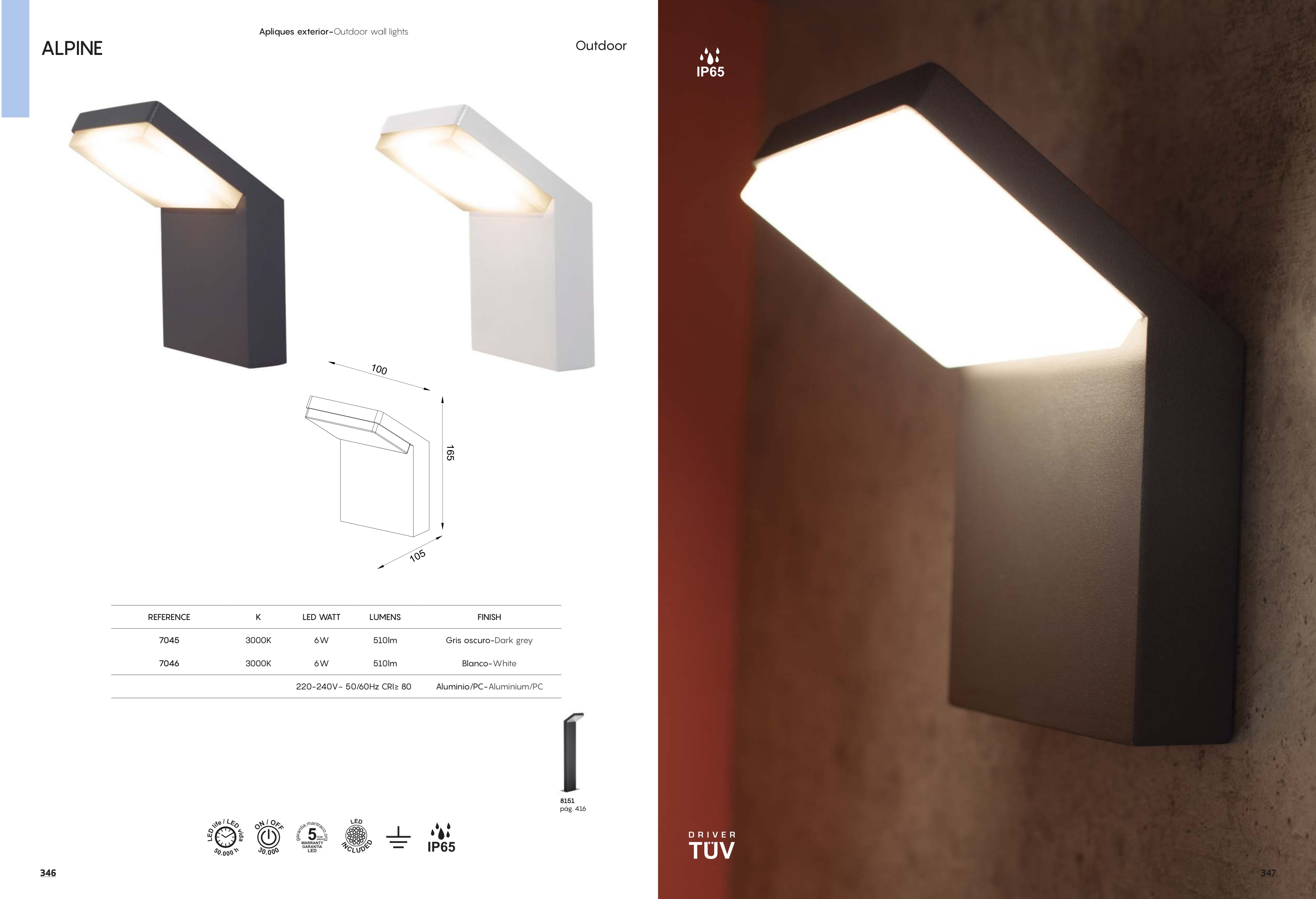 Осветителното тяло 7046 White 6W 3000K 510lm ALPINE представлява аплик, външна лампа в съвременен стил. 7046 White 6W 3000K 510lm ALPINE е от категорията осветителни тела и е подходящо за осветяване на различни помещения и пространства като: външно осветление, фасадно осветление.