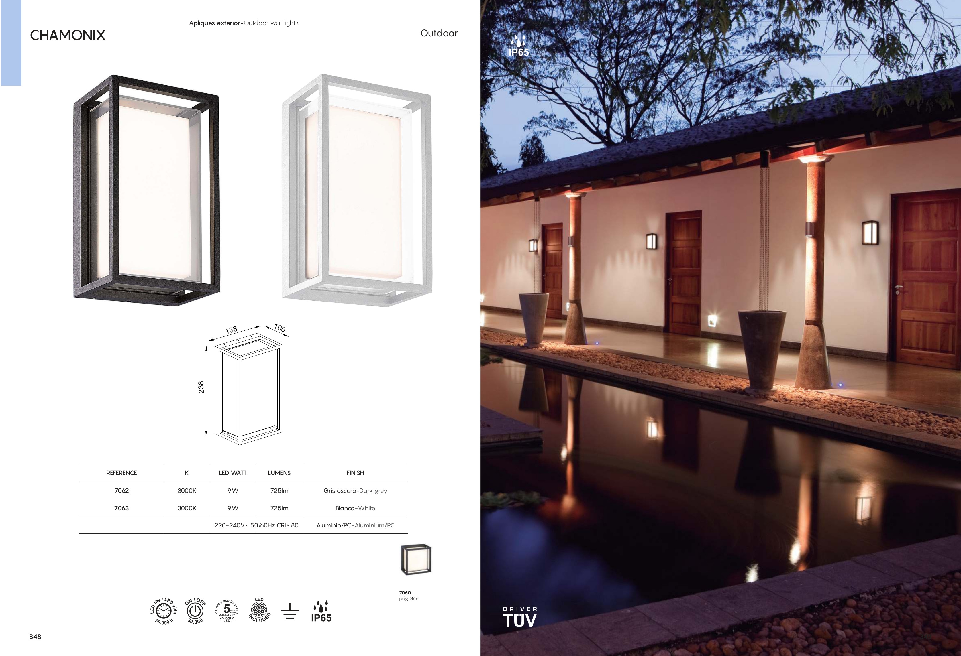 Осветителното тяло 7062 Dark Grey 9W 3000K 725lm CHAMONIX ще осигури комфорт и естетика във всяко помещение, в което се постави. Цялостната визия и дизайн на лампата и вложените в изработката й материали, като алуминий в тъмно сив цвят, полимер в бяло, ще допринесат за един неповторим стил. Благодарение на дългогодишния опит, качествените материали и строгия контрол на качеството на изработка на производителя Mantra (Испания), 7062 Dark Grey 9W 3000K 725lm CHAMONIX е на високо европейско ниво.