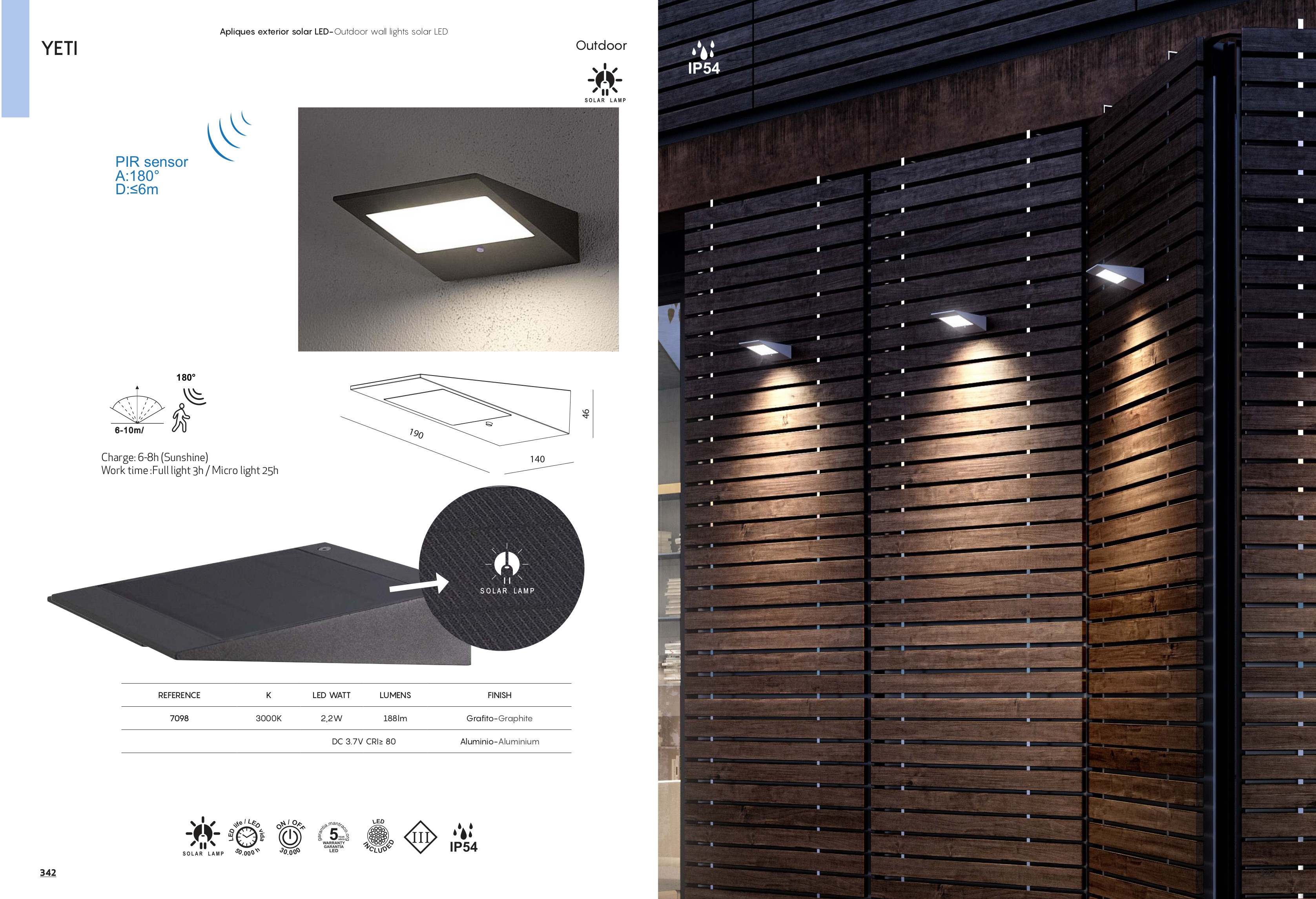 Осветителното тяло ^7098 2.2W/3000K IP54 Grafito ще осигури комфорт и естетика във всяко помещение, в което се постави. Цялостната визия и дизайн на лампата и вложените в изработката й материали, като алуминий в цвят графит, осветително тяло със соларно зареждане и сензор за движение, ще допринесат за един неповторим стил. Благодарение на дългогодишния опит, качествените материали и строгия контрол на качеството на изработка на производителя Mantra (Испания), ^7098 2.2W/3000K IP54 Grafito е на високо европейско ниво.