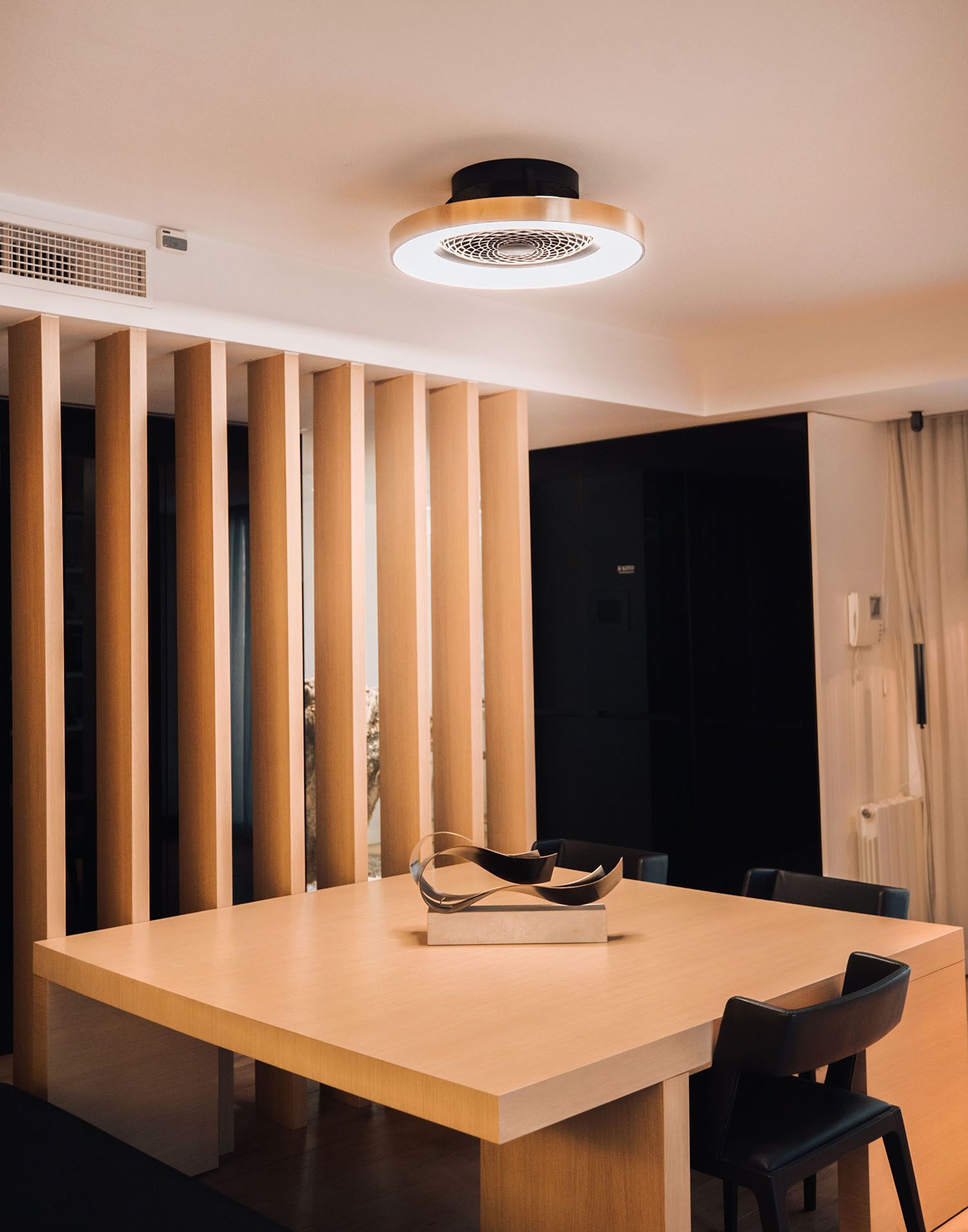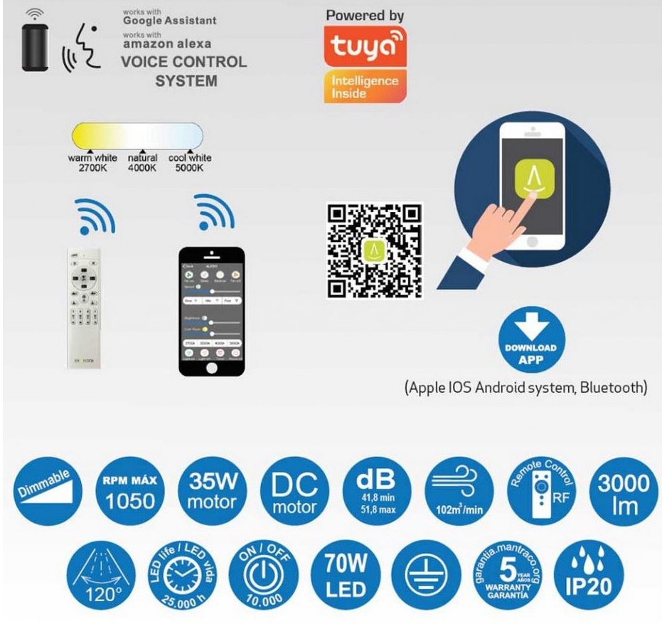 метал в черен цвят, метал в цвят злато, полимер (ABS) в бяло, интегриран вентилатор с DC мотор 35W, дистанционно, гласов контрол, приложение за смартфон
