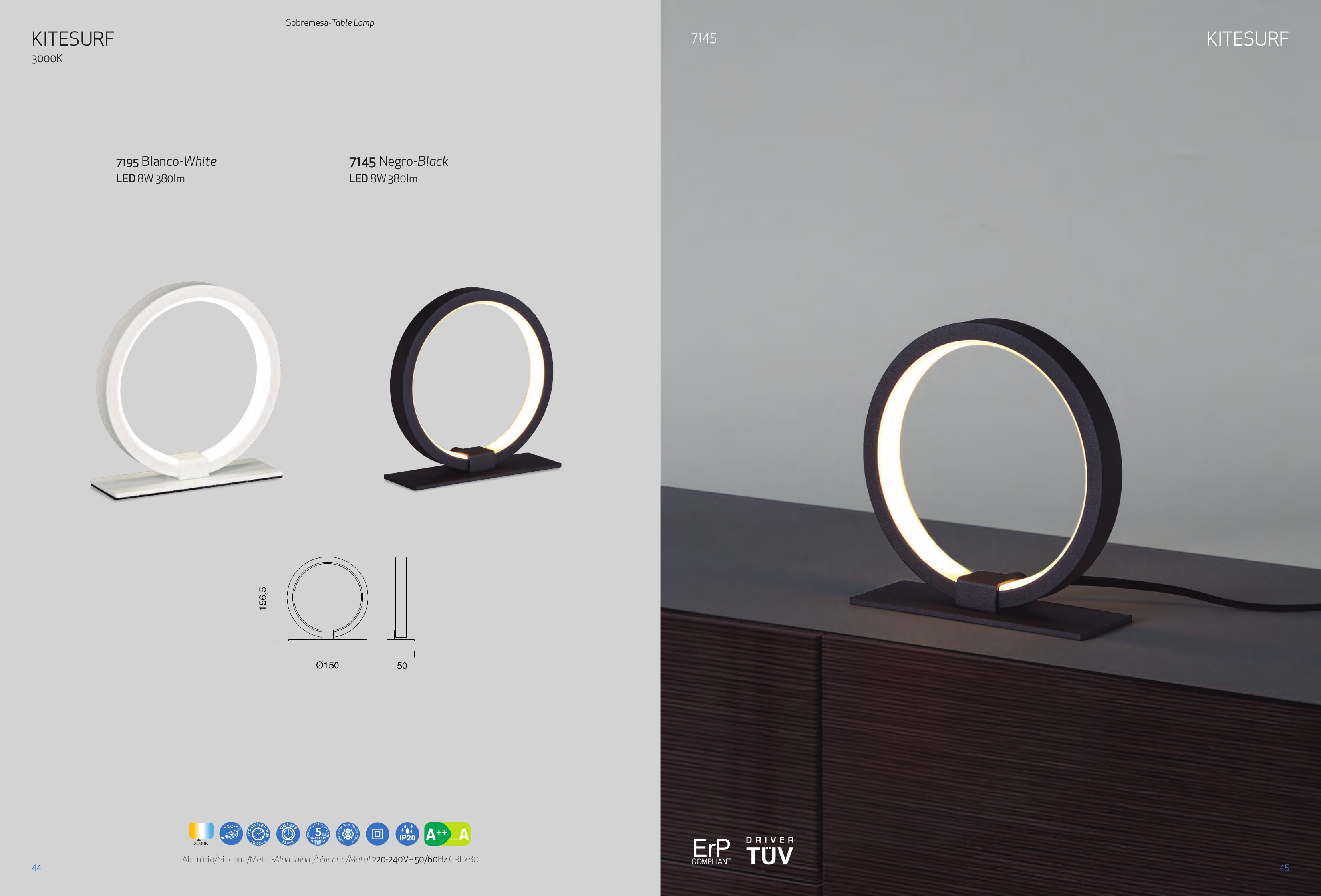 Осветителното тяло 7145 Black 8W 3000K 380lm KITESURF -Black ще осигури комфорт и естетика във всяко помещение, в което се постави. Цялостната визия и дизайн на лампата и вложените в изработката й материали, като метал в черен цвят, алуминий, силикон, ще допринесат за един неповторим стил. Благодарение на дългогодишния опит, качествените материали и строгия контрол на качеството на изработка на производителя Mantra (Испания), 7145 Black 8W 3000K 380lm KITESURF -Black е на високо европейско ниво.