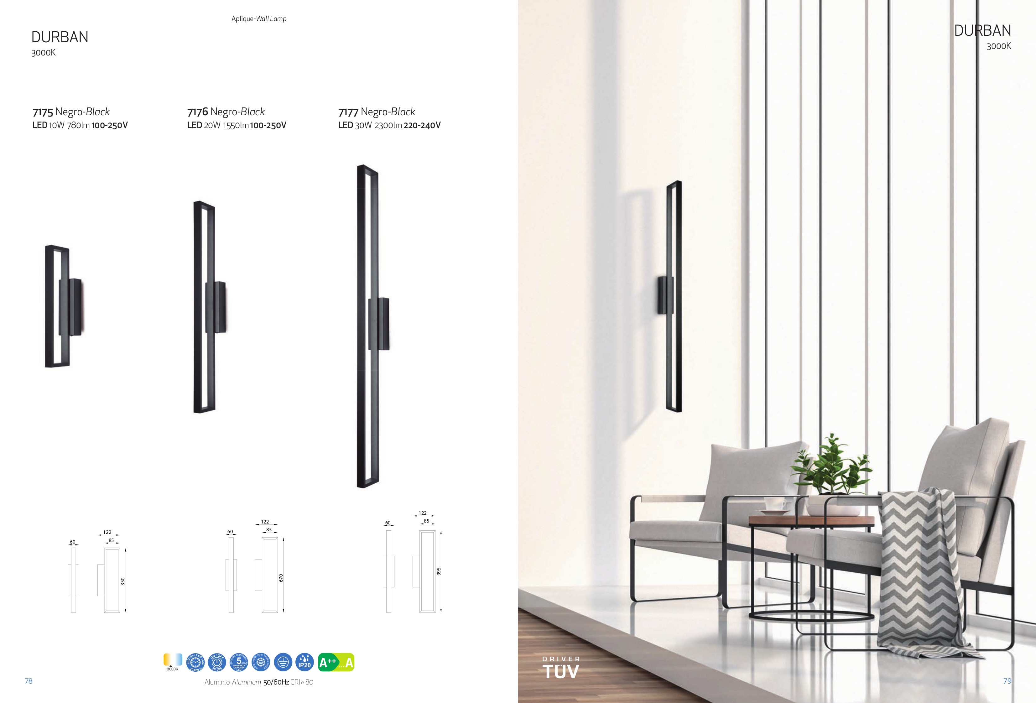 Лед аплик 7176 Black 20W 3000K 1550lm DURBAN ще осигури комфорт и естетика във всяко помещение, в което се постави. Цялостната визия и дизайн на led лампата и вложените в изработката й материали, като алуминий в черен цвят, ще допринесат за един неповторим стил. Благодарение на дългогодишния опит в производството на лед осветление, качествените материали и строгия контрол на качеството на изработка на производителя Mantra (Испания), 7176 Black 20W 3000K 1550lm DURBAN е на високо европейско ниво.