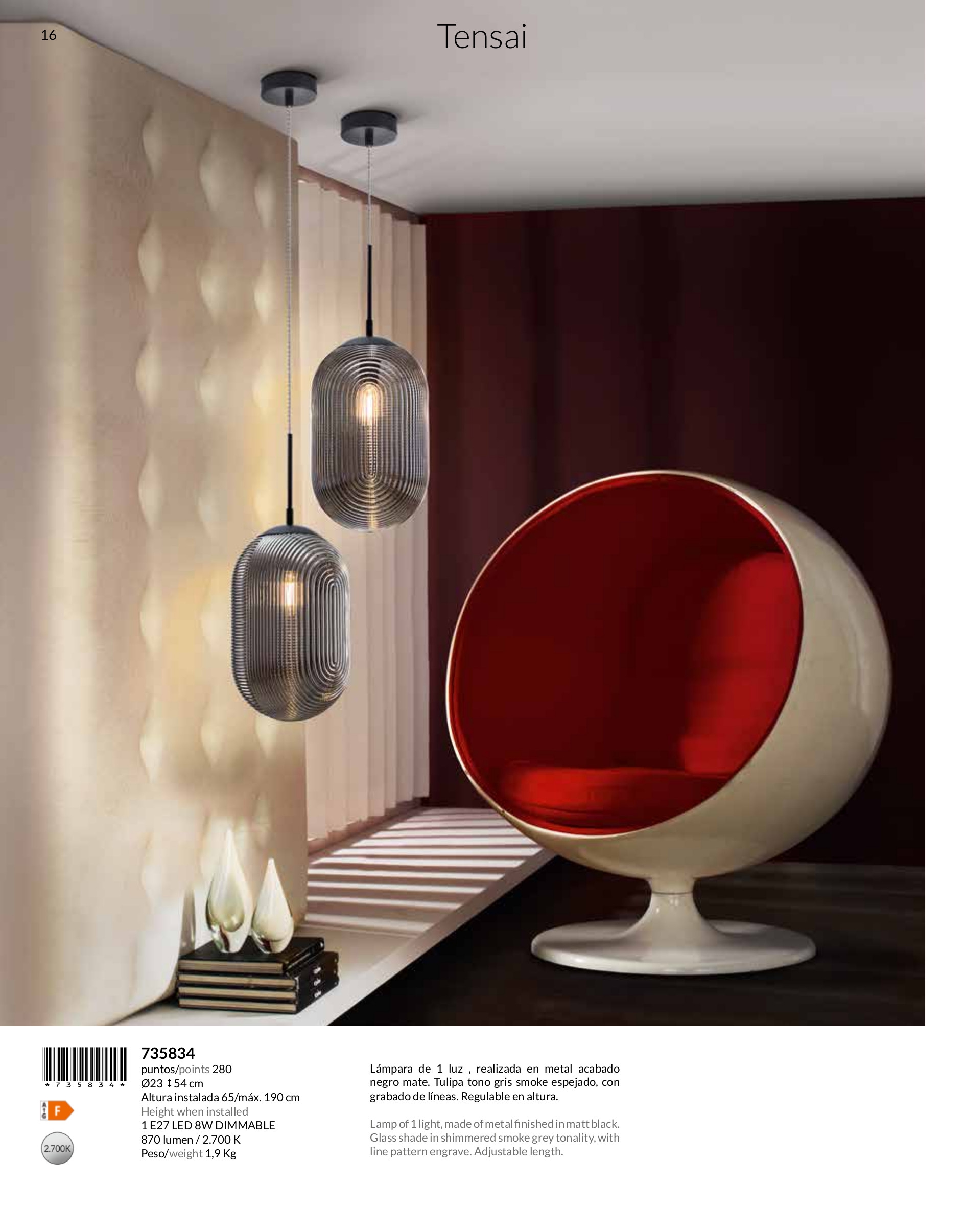 Осветителното тяло 735834 TENSAI 1L LAMP SMOKE 22? представлява пендел в съвременен стил. 735834 TENSAI 1L LAMP SMOKE 22? е от категорията осветителни тела и е подходящо за осветяване на различни помещения и пространства като: всекидневна / хол, спалня, кухня, трапезария, коридор, антре, офис.