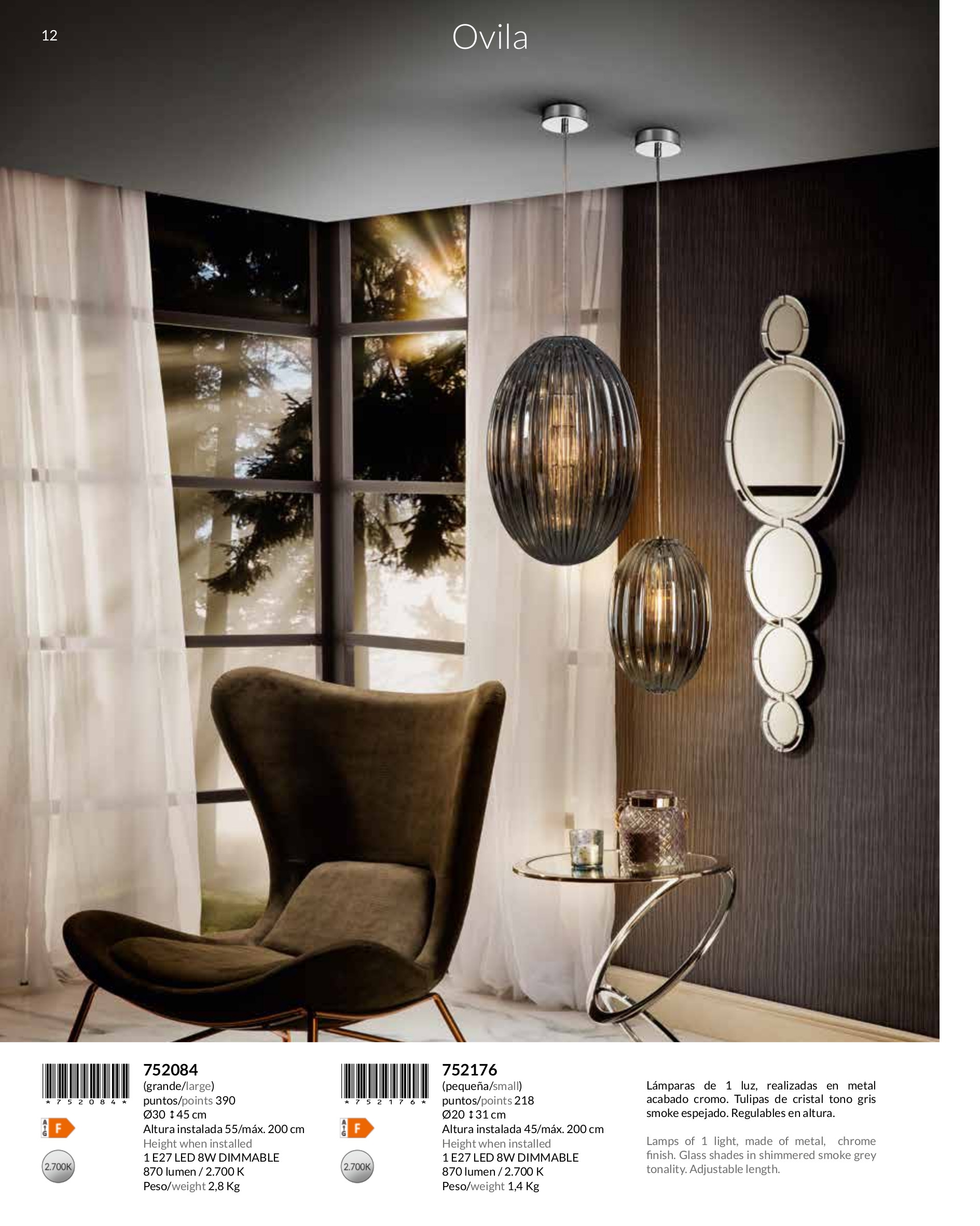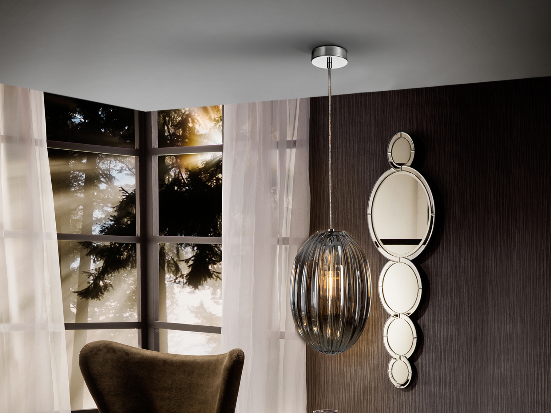 Осветителното тяло 752176 OVILA smoke d20 ще осигури комфорт и естетика във всяко помещение, в което се постави. Цялостната визия и дизайн на лампата и вложените в изработката й материали, като метал с хромирано покритие, стъклен дифузер от релефно стъкло в тоналност опушено сиво, димируем, ще допринесат за един неповторим стил. Благодарение на дългогодишния опит, качествените материали и строгия контрол на качеството на изработка на производителя Schuller (Испания), 752176 OVILA smoke d20 е на високо европейско ниво.
