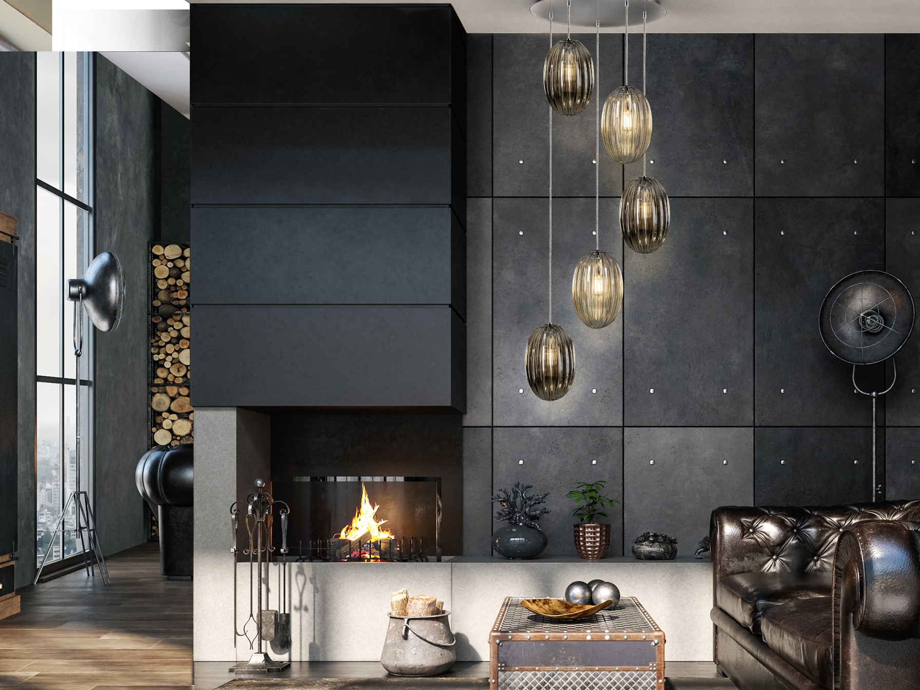 метал с хромирано покритие, комбинация от малки и големи стъклени абажури от релефно стъкло в две тоналности - коняк и блестящо опушено сиво, димируем