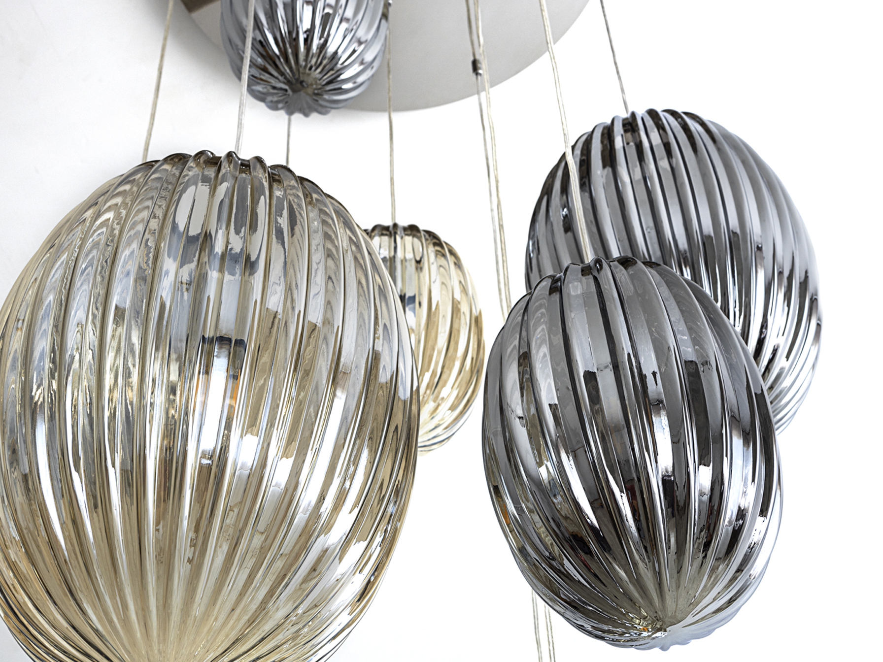 метал с хромирано покритие, комбинация от малки и големи стъклени абажури от релефно стъкло в два цвята - коняк и опушено стъкло, димируем с включено дистанционно