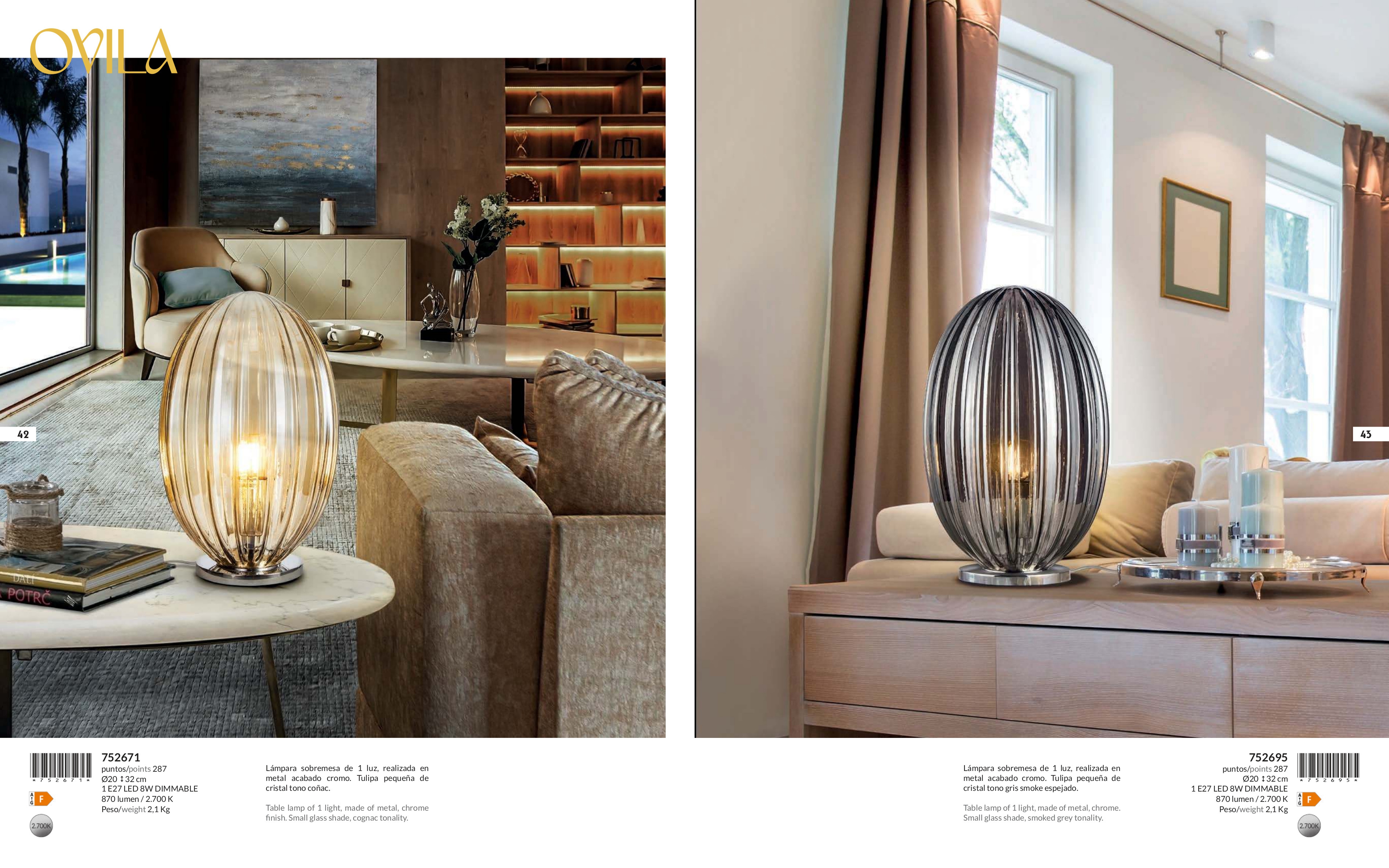 Осветителното тяло 752695 OVILA ще осигури комфорт и естетика във всяко помещение, в което се постави. Цялостната визия и дизайн на лампата и вложените в изработката й материали, като метал с хромирано покритие, стъклен дифузер от релефно опушено стъкло, димируем, ще допринесат за един неповторим стил. Благодарение на дългогодишния опит, качествените материали и строгия контрол на качеството на изработка на производителя Schuller (Испания), 752695 OVILA е на високо европейско ниво.