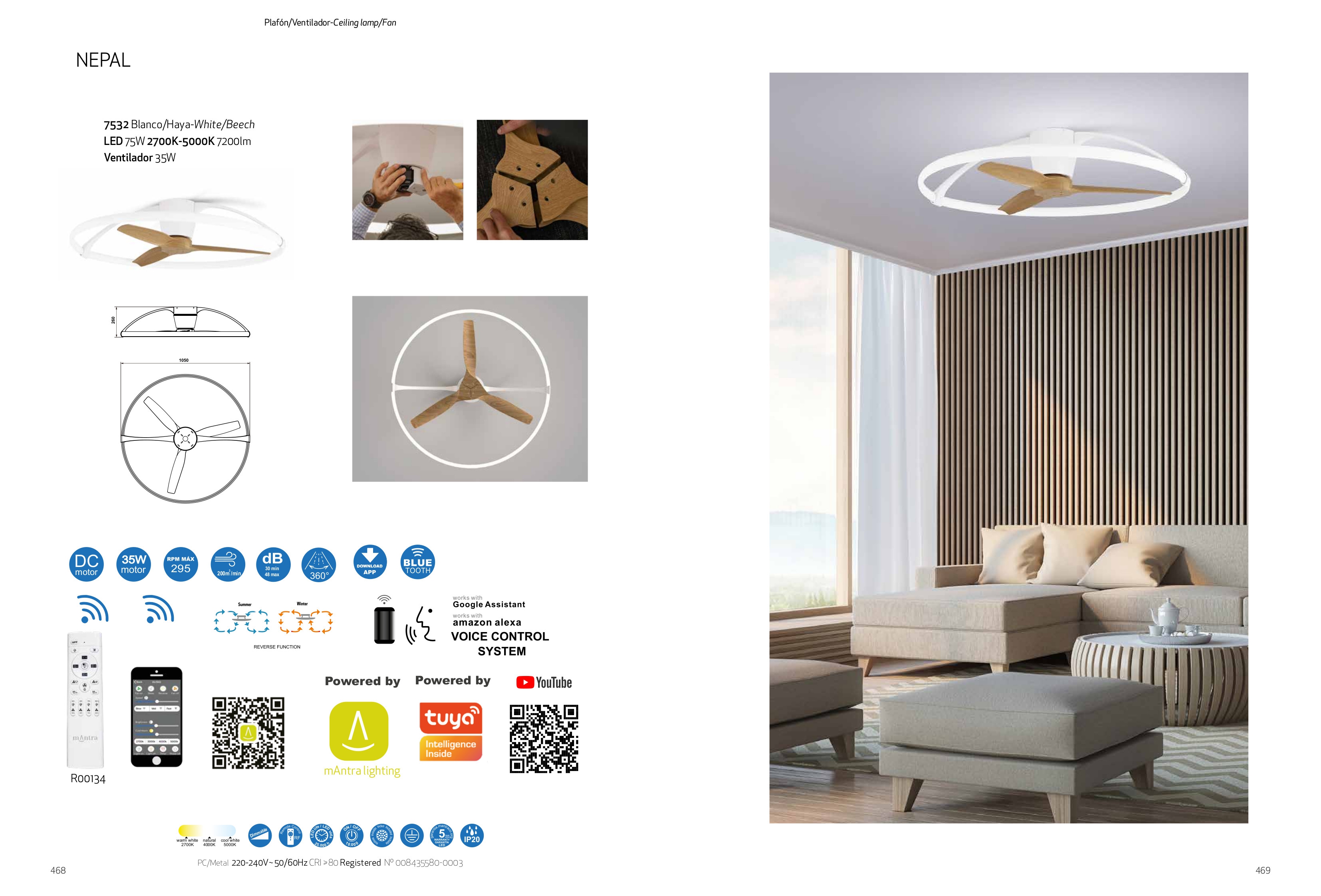 Осветителното тяло 7532 White/ ImitationWood 75W 2700K-5000K NEPAL ще осигури комфорт и естетика във всяко помещение, в което се постави. Цялостната визия и дизайн на лампата и вложените в изработката й материали, като метал в бял цвят, перка в цвят бук, дифузер в млечно бяло, дистанционно + гласов контрол, bluetooth, ще допринесат за един неповторим стил. Благодарение на дългогодишния опит, качествените материали и строгия контрол на качеството на изработка на производителя Mantra (Испания), 7532 White/ ImitationWood 75W 2700K-5000K NEPAL е на високо европейско ниво.
