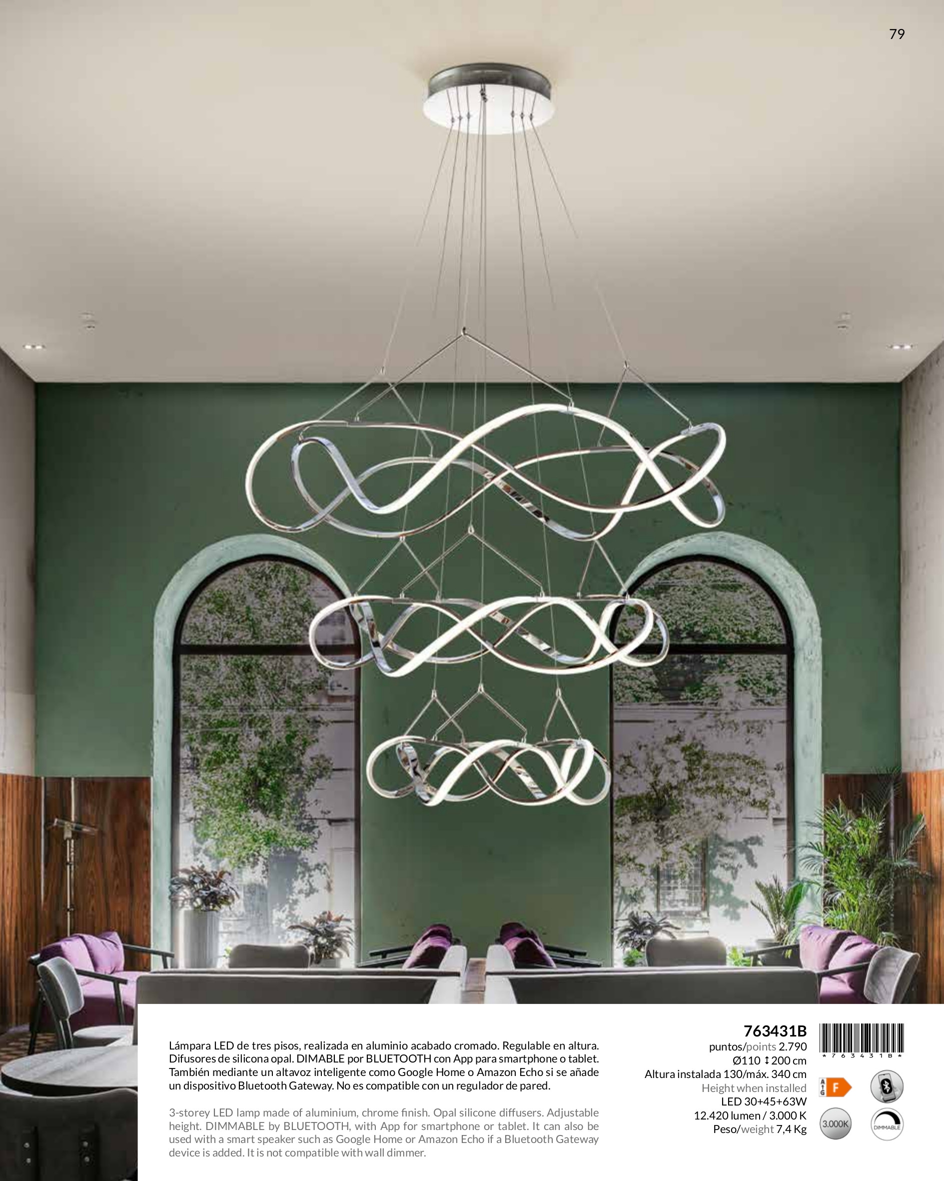 Осветителното тяло 763431B MOLLY ще осигури комфорт и естетика във всяко помещение, в което се постави. Цялостната визия и дизайн на лампата и вложените в изработката й материали, като полиран алуминий с покритие от хром, дифузери от силикон в опалово бял цвят, димиране чрез BLUETOOTH с APP за смартфон или високоговорител като Google Home или Amazon Echo, ще допринесат за един неповторим стил. Благодарение на дългогодишния опит, качествените материали и строгия контрол на качеството на изработка на производителя Schuller (Испания), 763431B MOLLY е на високо европейско ниво.