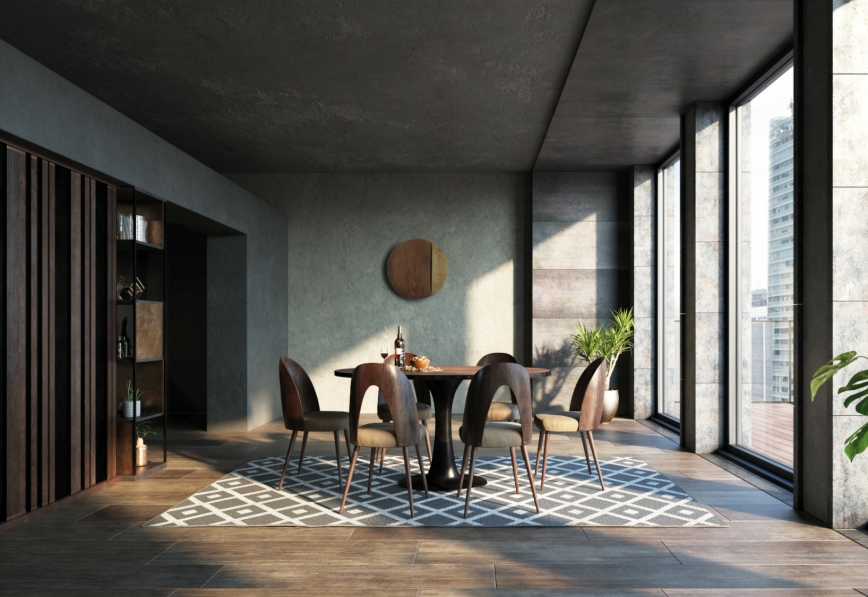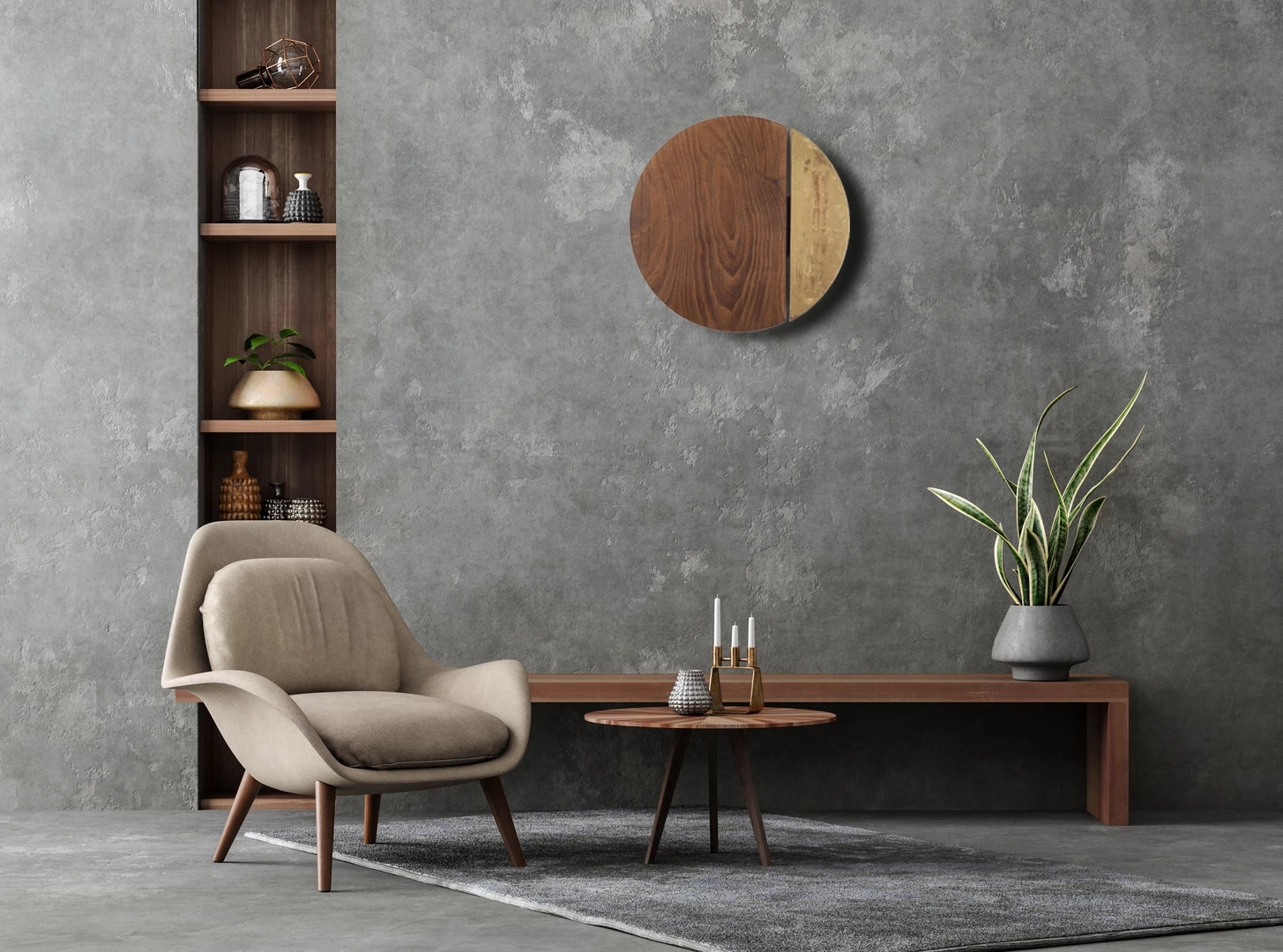 шперплат в цвят на тъмно дърво, стомана в цвят старо злато и черно