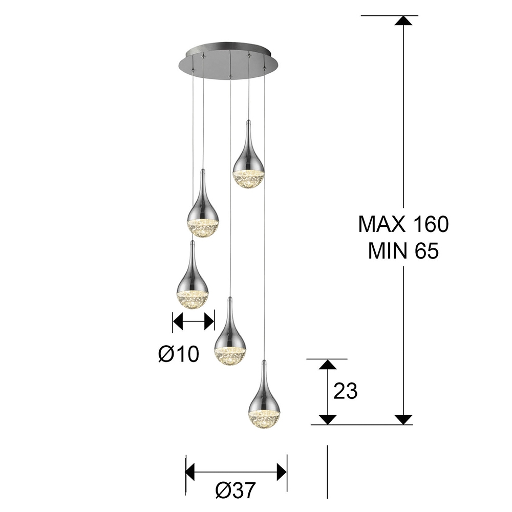 Осветителното тяло 773572 ELIE LAMP 5L. ?37, CHROME ще осигури комфорт и естетика във всяко помещение, в което се постави. Цялостната визия и дизайн на лампата и вложените в изработката й материали, като хромиран метал, дифузьор във форма на капка от масивно стъклос декоративни мехурчета вътре и хромирана метална шапка, ще допринесат за един неповторим стил. Благодарение на дългогодишния опит, качествените материали и строгия контрол на качеството на изработка на производителя Schuller (Испания), 773572 ELIE LAMP 5L. ?37, CHROME е на високо европейско ниво.