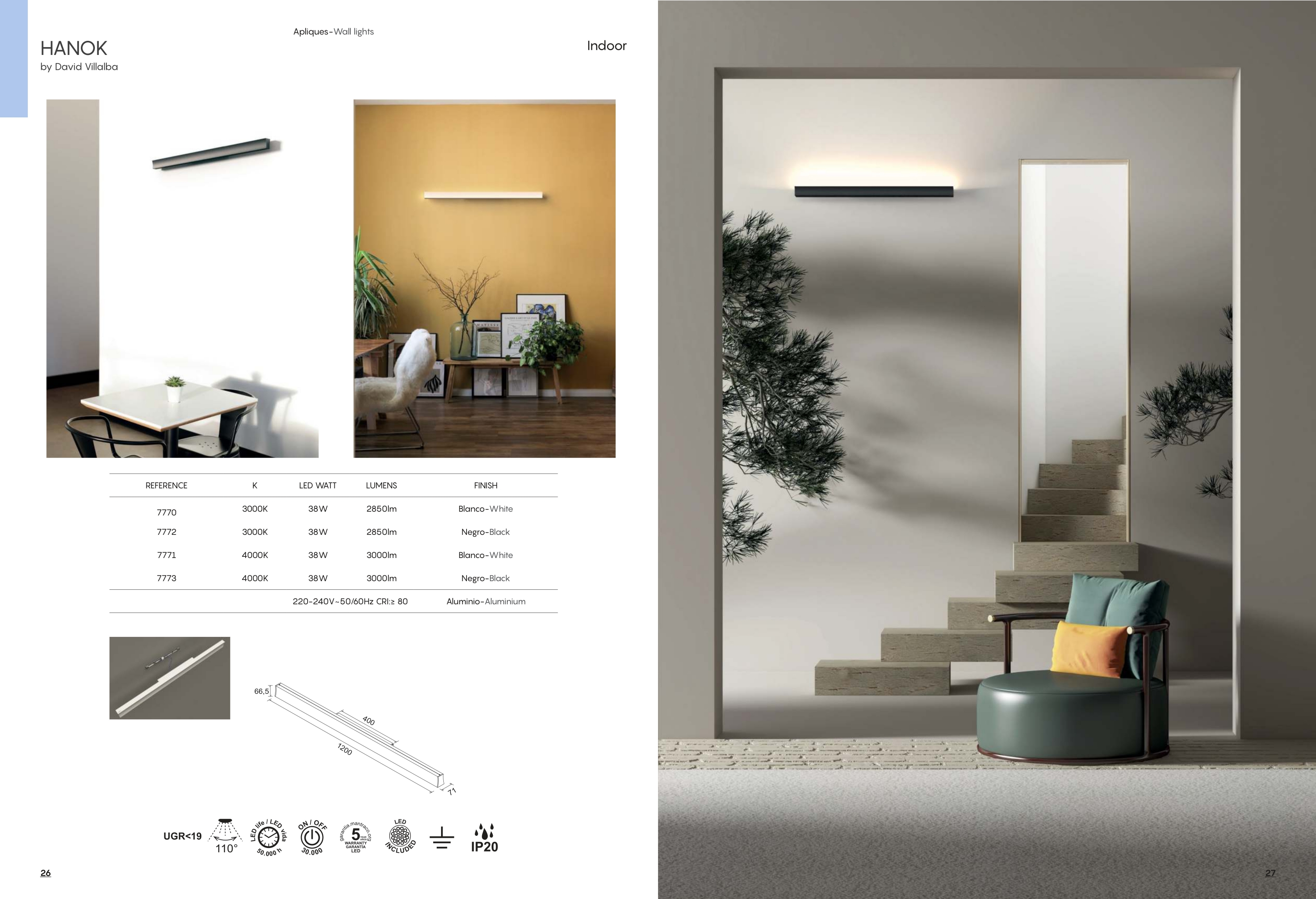 Осветителното тяло 7771 White 38W 4000K 3000lm HANOK представлява аплик в съвременен стил. 7771 White 38W 4000K 3000lm HANOK е от категорията осветителни тела и е подходящо за осветяване на различни помещения и пространства като: всекидневна / хол, спалня, кухня, трапезария, коридор, антре, стълбище, офис.