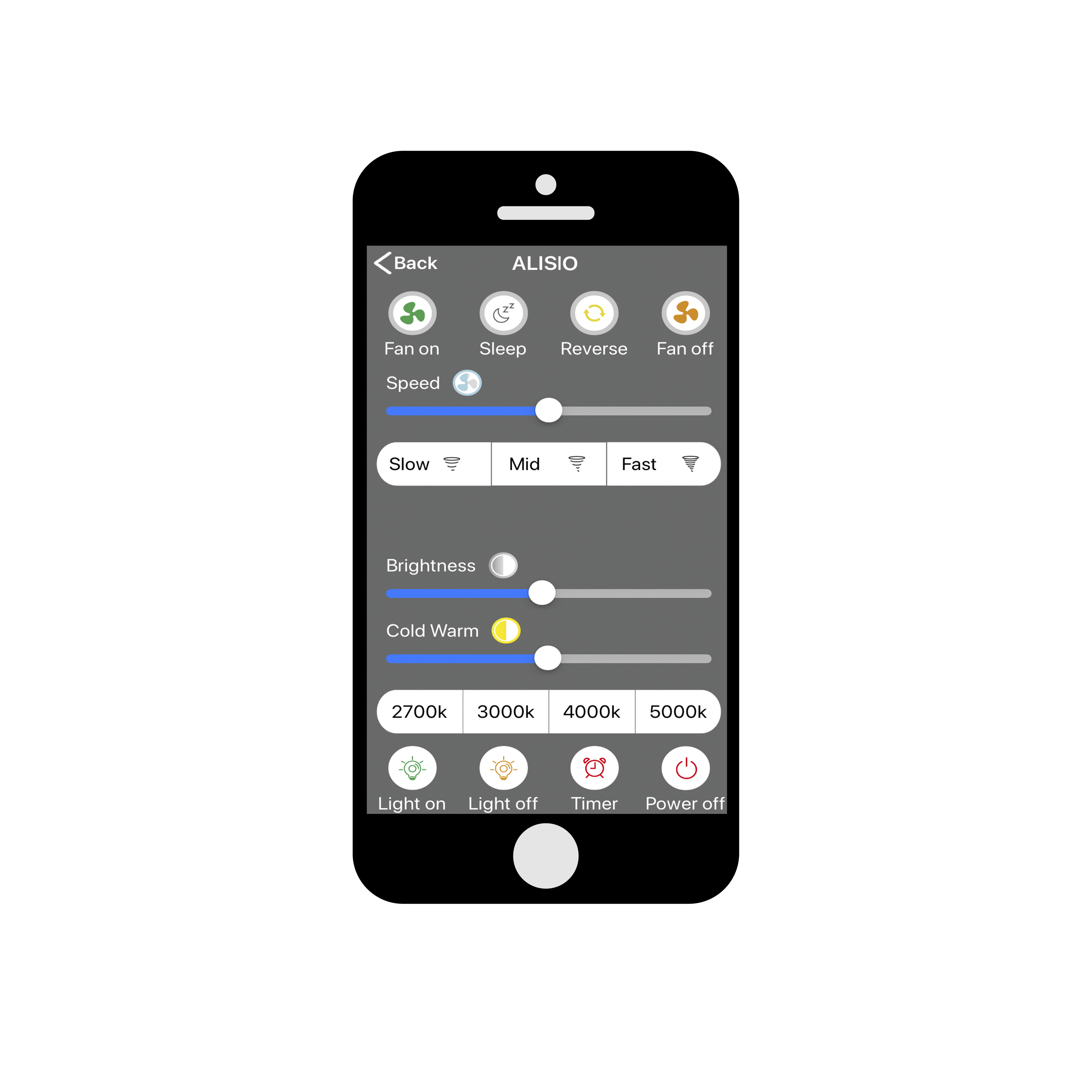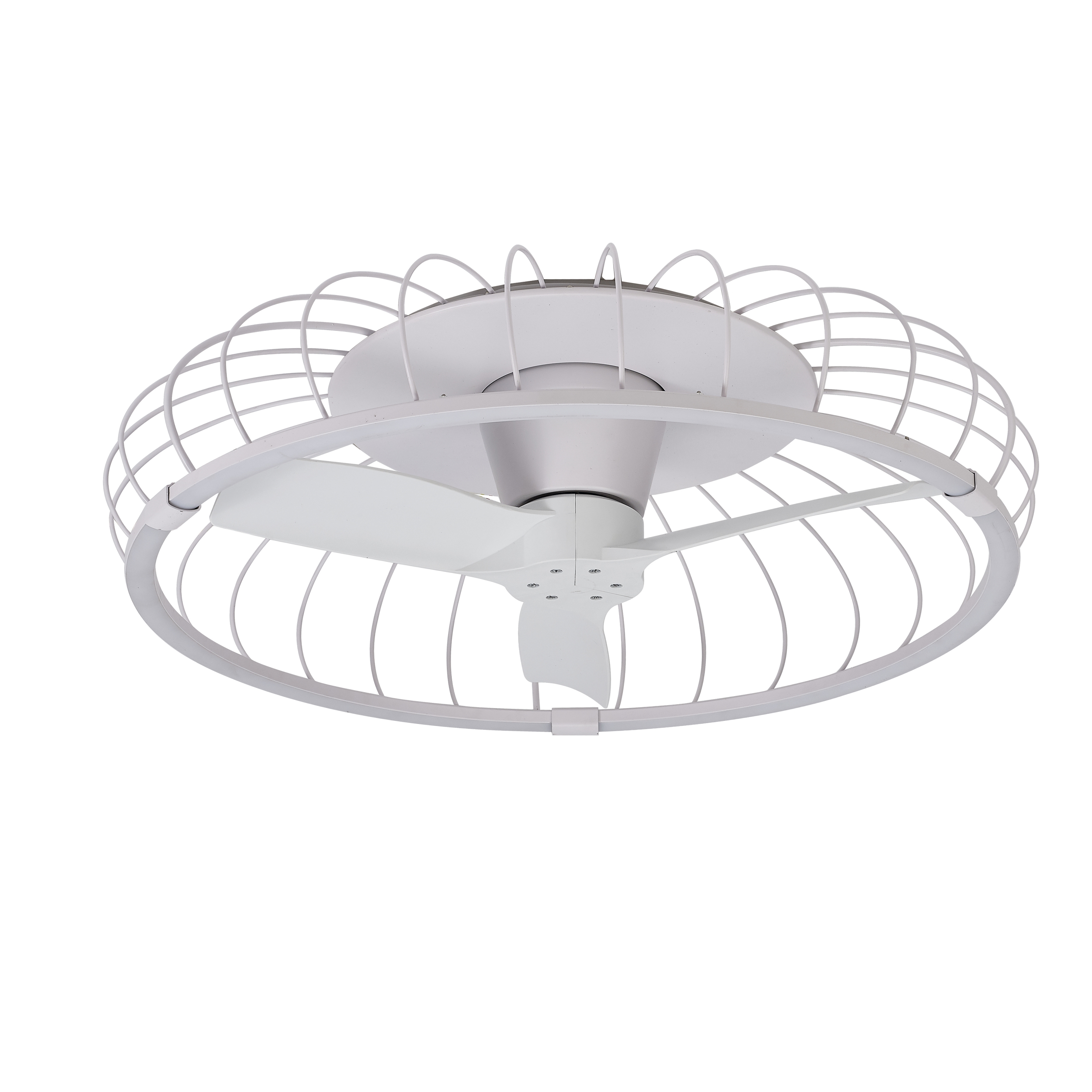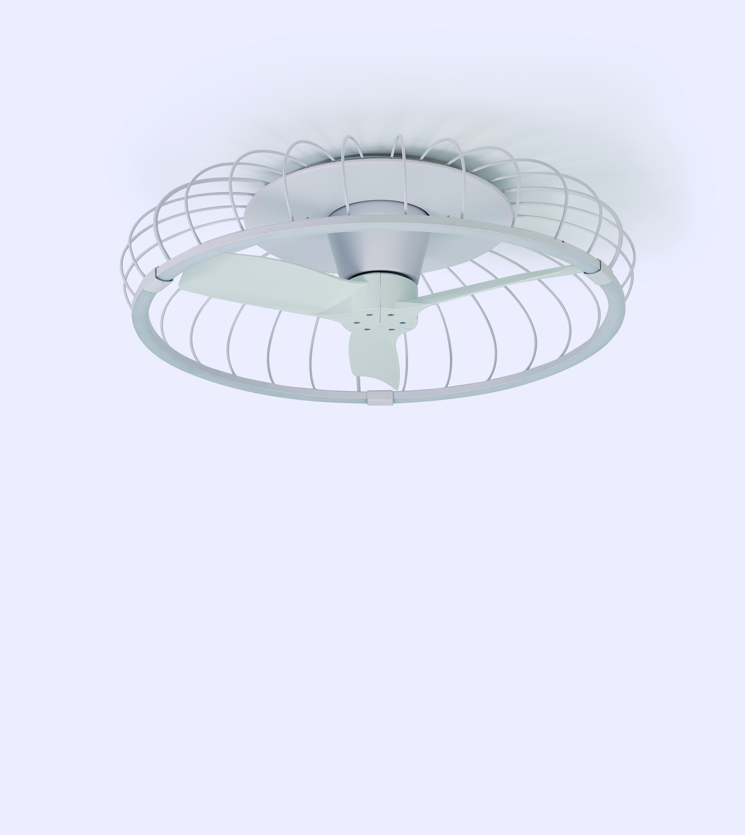 метал, акрил и полимер (ABS) в бяло, интегриран вентилатор с DC мотор 30W, регулиране на цветната температура и посоката и силата на въздушния поток с дитанционно или приложение за смартфон