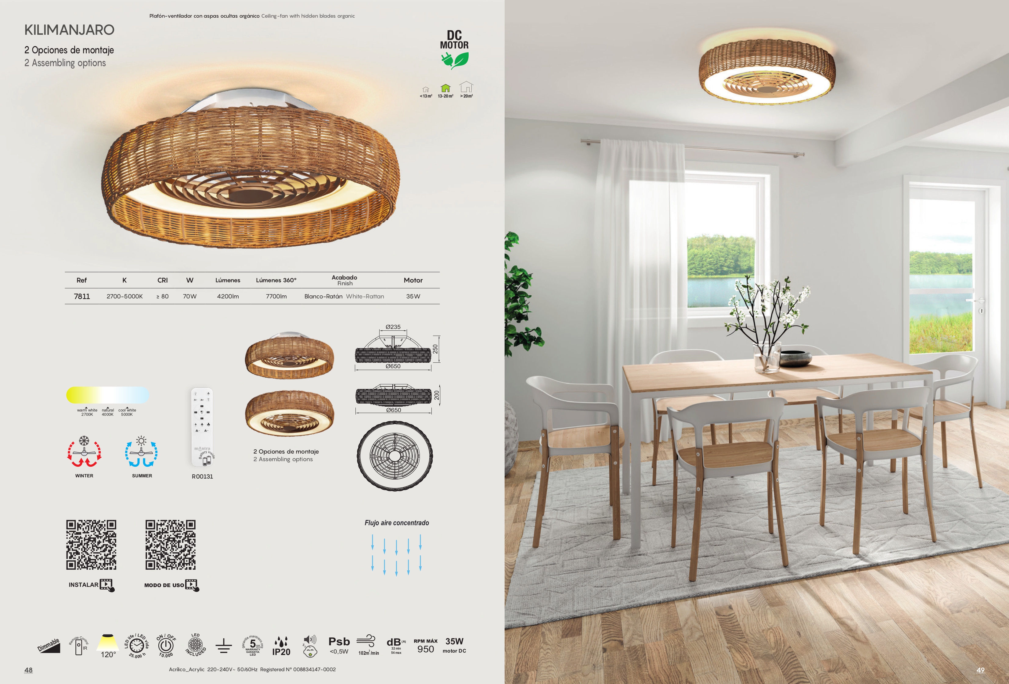 Осветителното тяло 7811 Rattan 70W 2700K-5000K 3000lm KILIMANJARO ще осигури комфорт и естетика във всяко помещение, в което се постави. Цялостната визия и дизайн на лампата и вложените в изработката й материали, като акрил в бяло, естествен ратан, интегриран вентилатор с DC мотор 25W, дистанционно, с което се регулира цветната температура и вентилатора, нощен режим, две опции за монтаж, ще допринесат за един неповторим стил. Благодарение на дългогодишния опит, качествените материали и строгия контрол на качеството на изработка на производителя Mantra (Испания), 7811 Rattan 70W 2700K-5000K 3000lm KILIMANJARO е на високо европейско ниво.