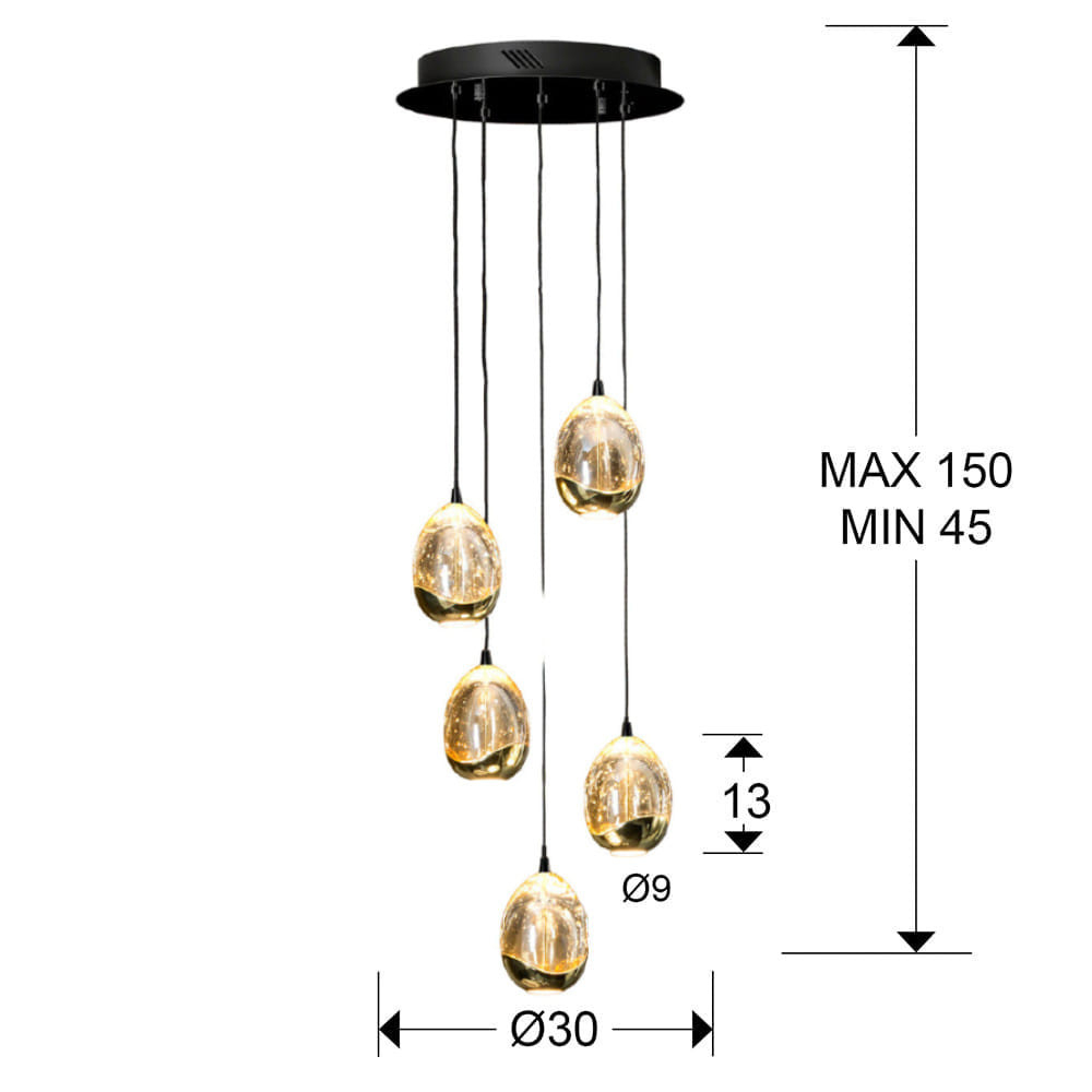 Лед полилей 783590 ROCIO - BLACK-GOLD LAMP D30 ще осигури комфорт и естетика във всяко помещение, в което се постави. Цялостната визия и дизайн на led лампата и вложените в изработката й материали, като метал с покритие с цвят злато, абажури от масивно стъкло с мехурчета вътре в цвят шампанско и метална основа в матово черен цвят, ще допринесат за един неповторим стил. Благодарение на дългогодишния опит в производството на лед осветление, качествените материали и строгия контрол на качеството на изработка на производителя Schuller (Испания), 783590 ROCIO - BLACK-GOLD LAMP D30 е на високо европейско ниво.