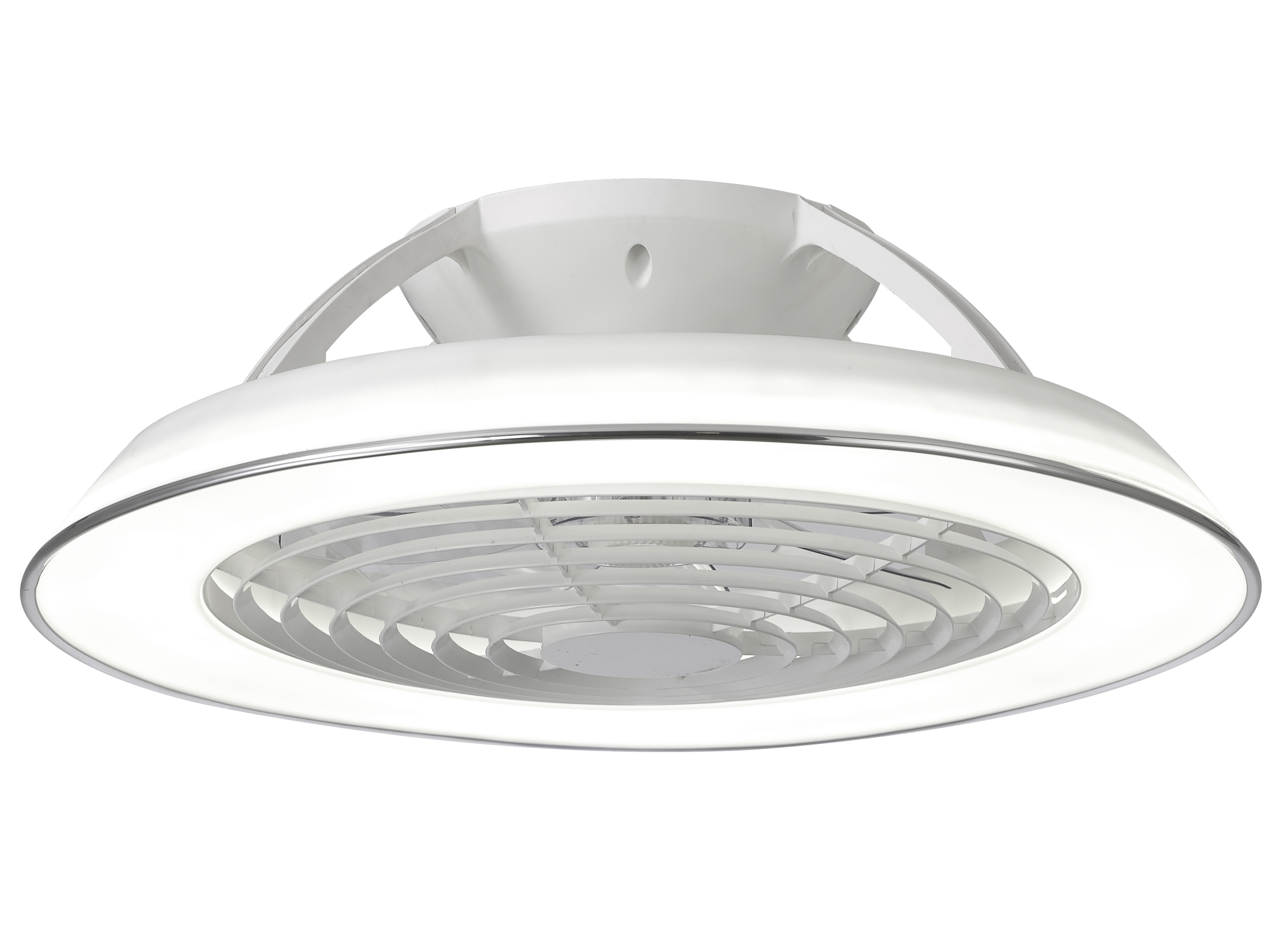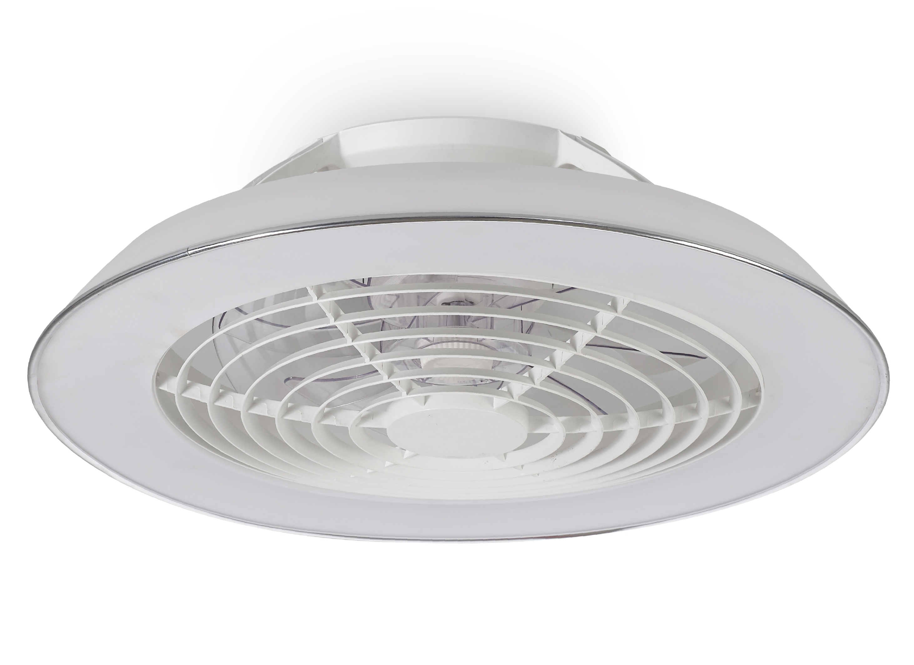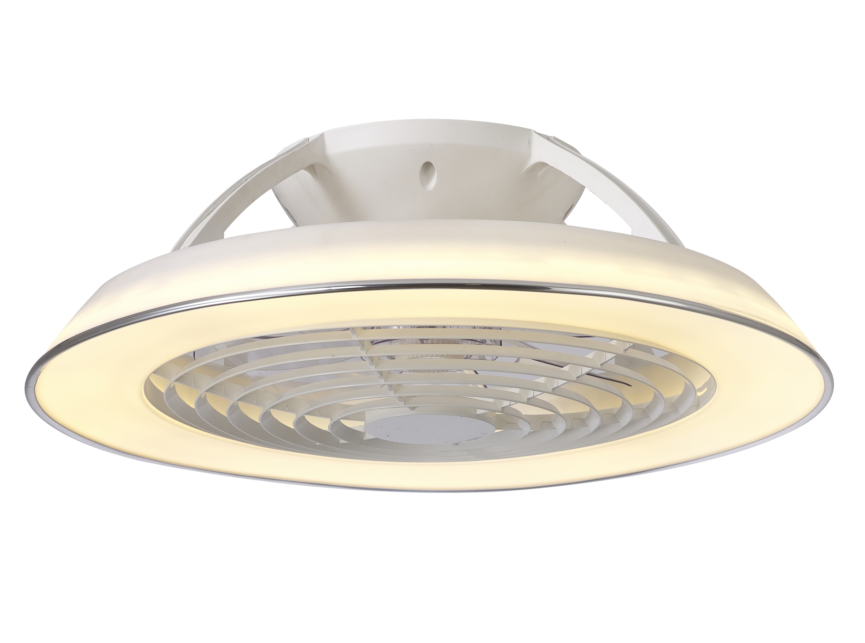 метал в бял цвят, прозрачна перка от полимер, дифузер в млечно бяло, интегриран вентилатор с DC мотор 35W, регулиране на цветната температура, посоката и силата на въздушния поток с дитанционно