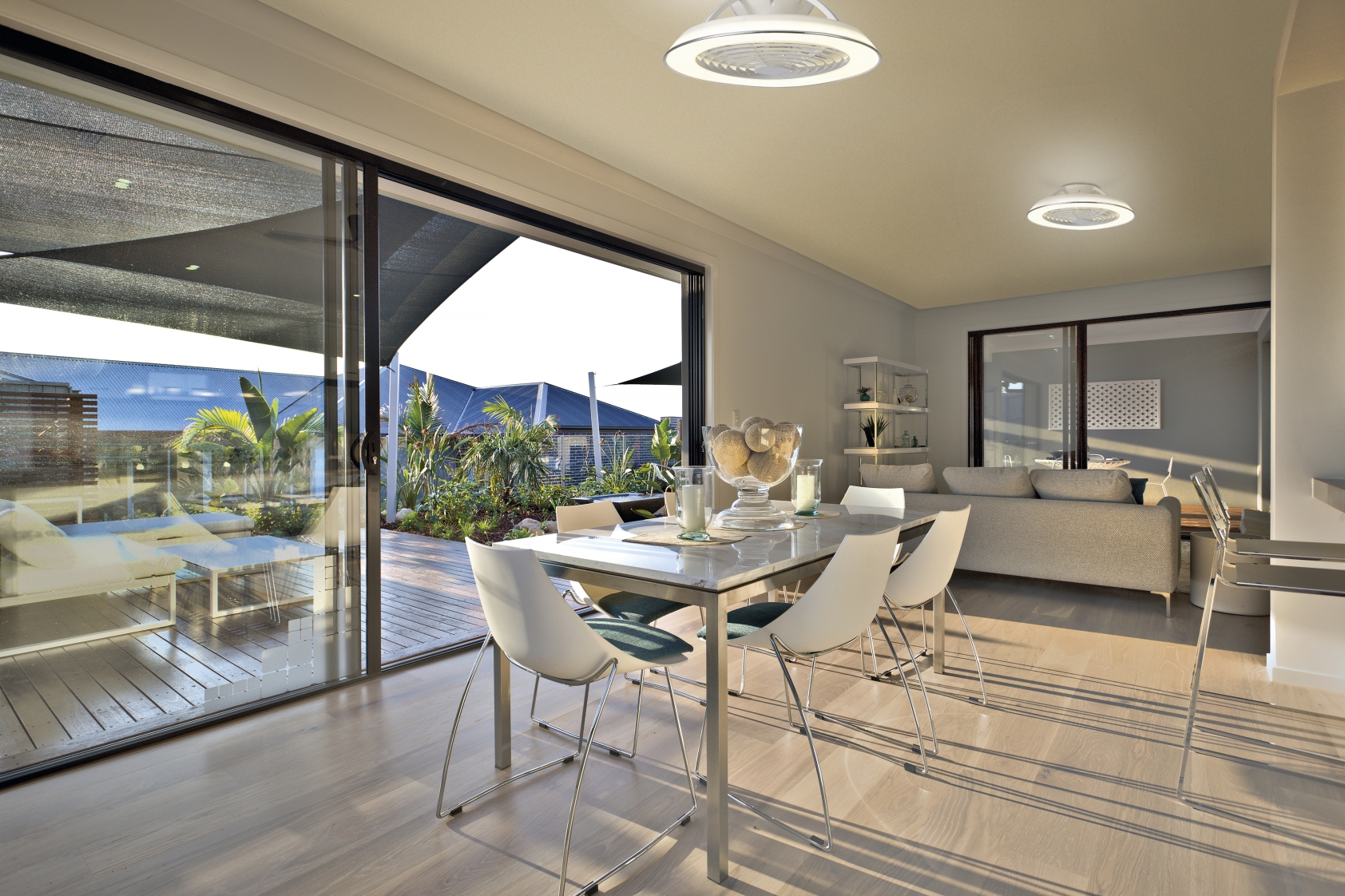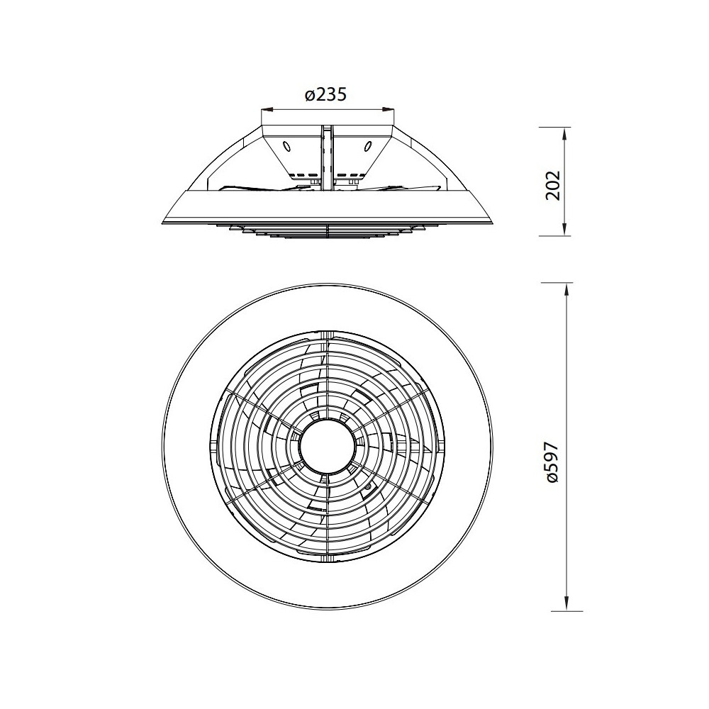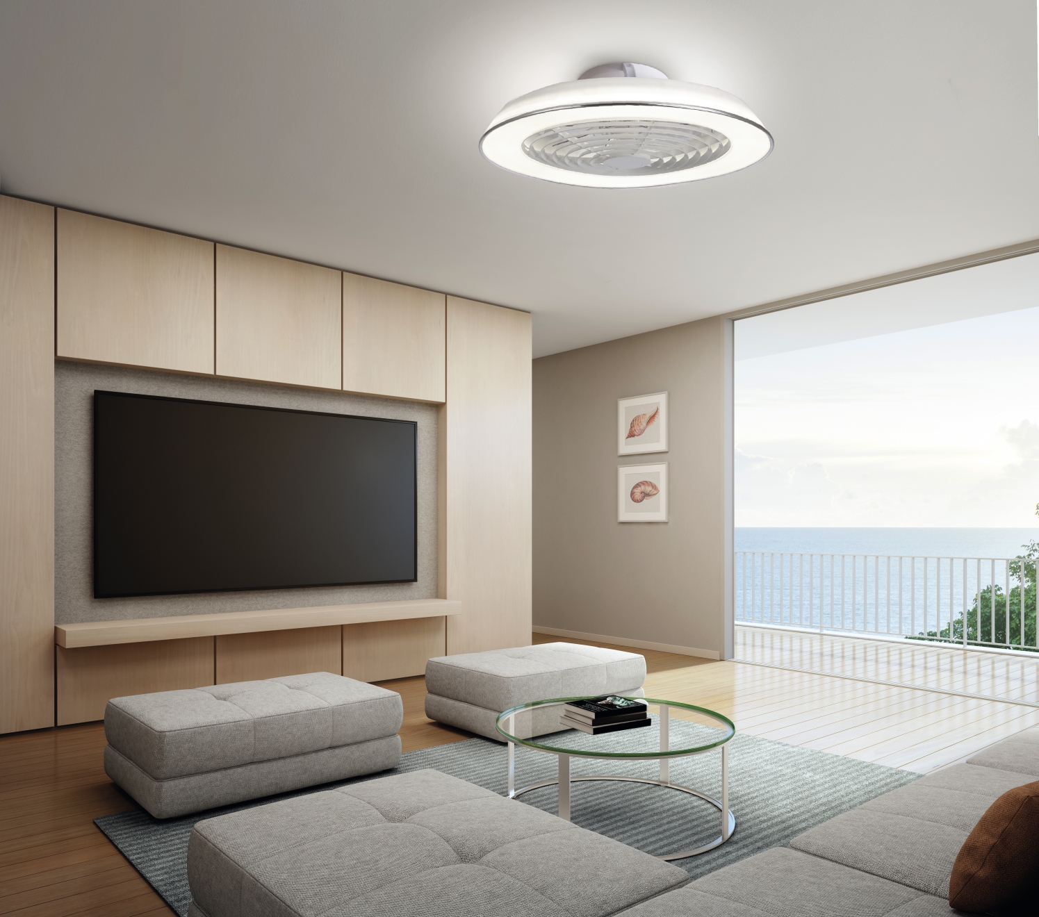 метал в бял цвят, прозрачна перка от полимер, дифузер в млечно бяло, интегриран вентилатор с DC мотор 35W, регулиране на цветната температура, посоката и силата на въздушния поток с дитанционно