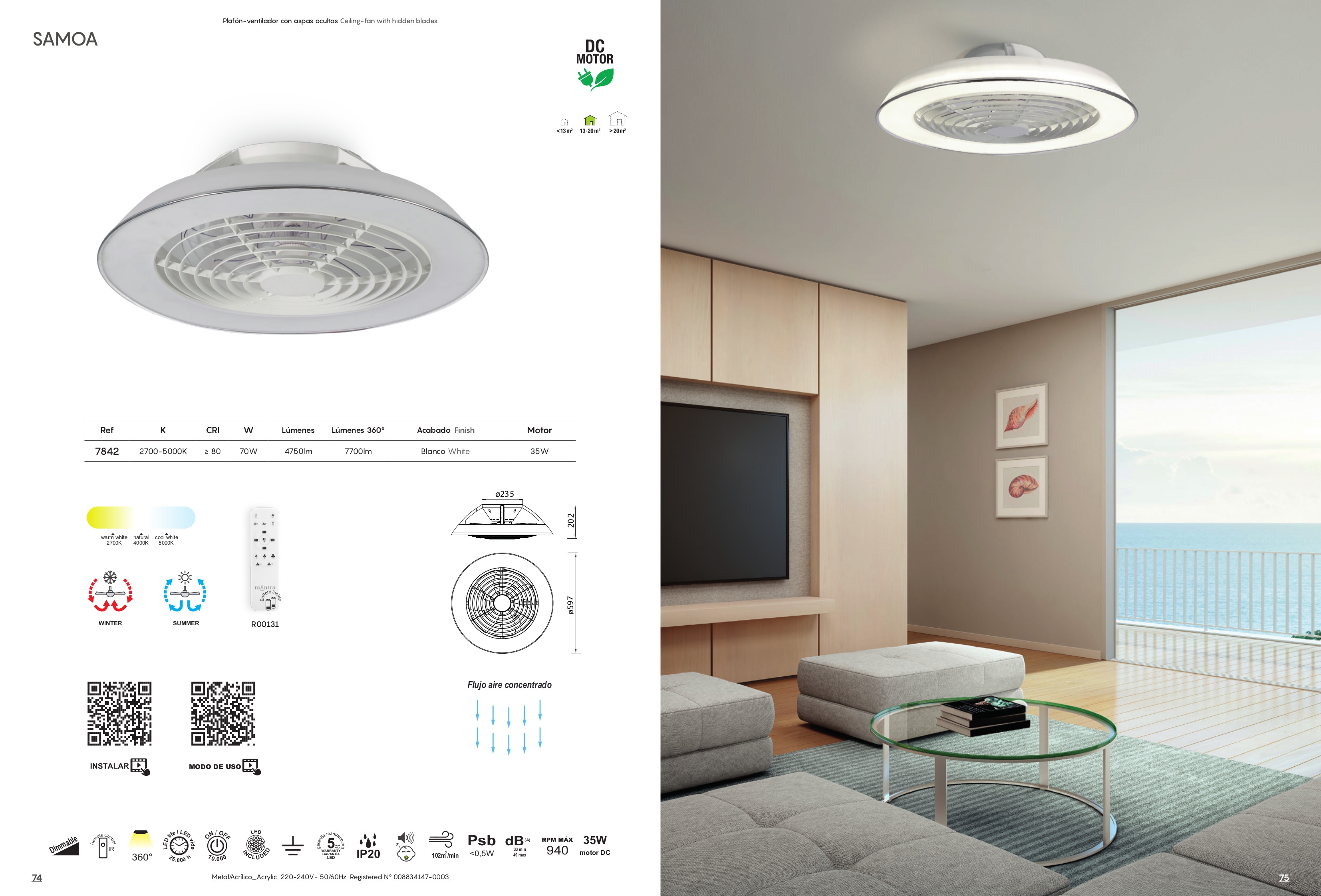 Осветителното тяло 7842 SAMOA Plafon LED 70W Ventilador 30W представлява плафон в съвременен стил. 7842 SAMOA Plafon LED 70W Ventilador 30W е от категорията осветителни тела и е подходящо за осветяване на различни помещения и пространства като: всекидневна / хол, спалня, кухня, трапезария, офис.