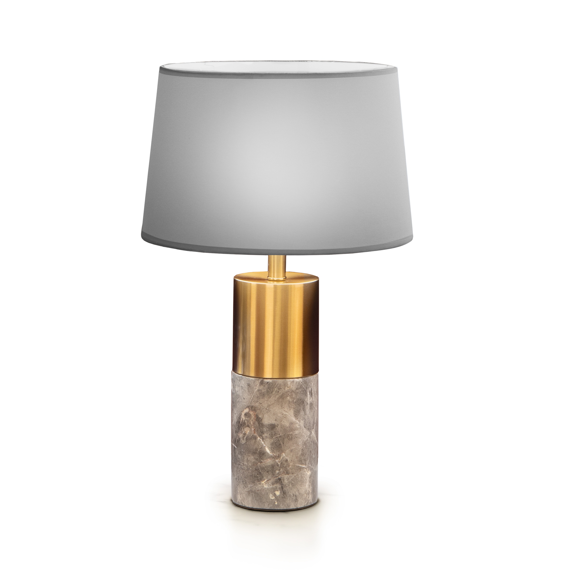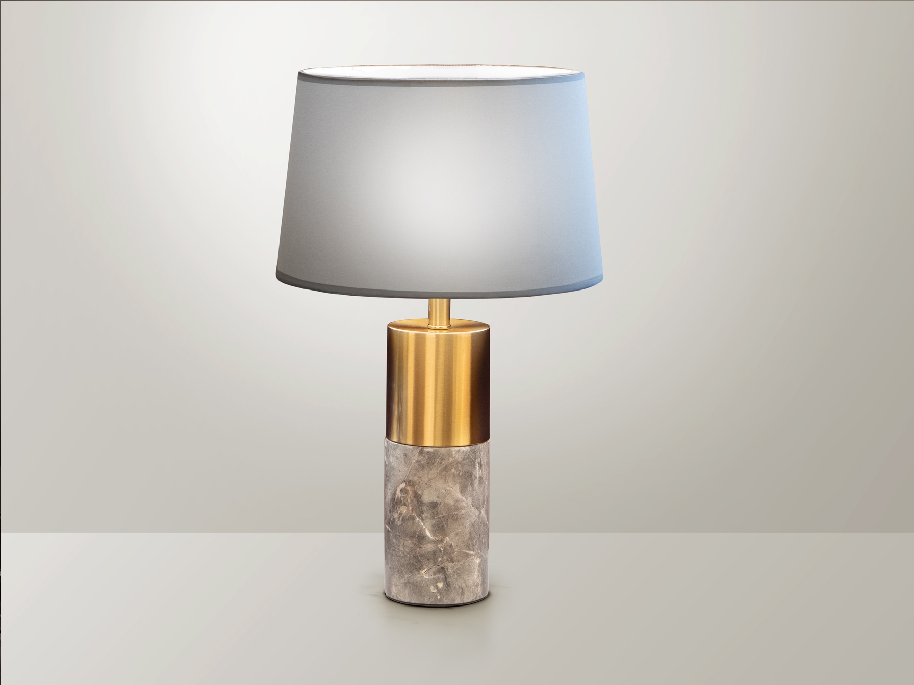 сив мрамор, метал с покритие от сатениран бронз, абажур от текстил в светло сив цвят