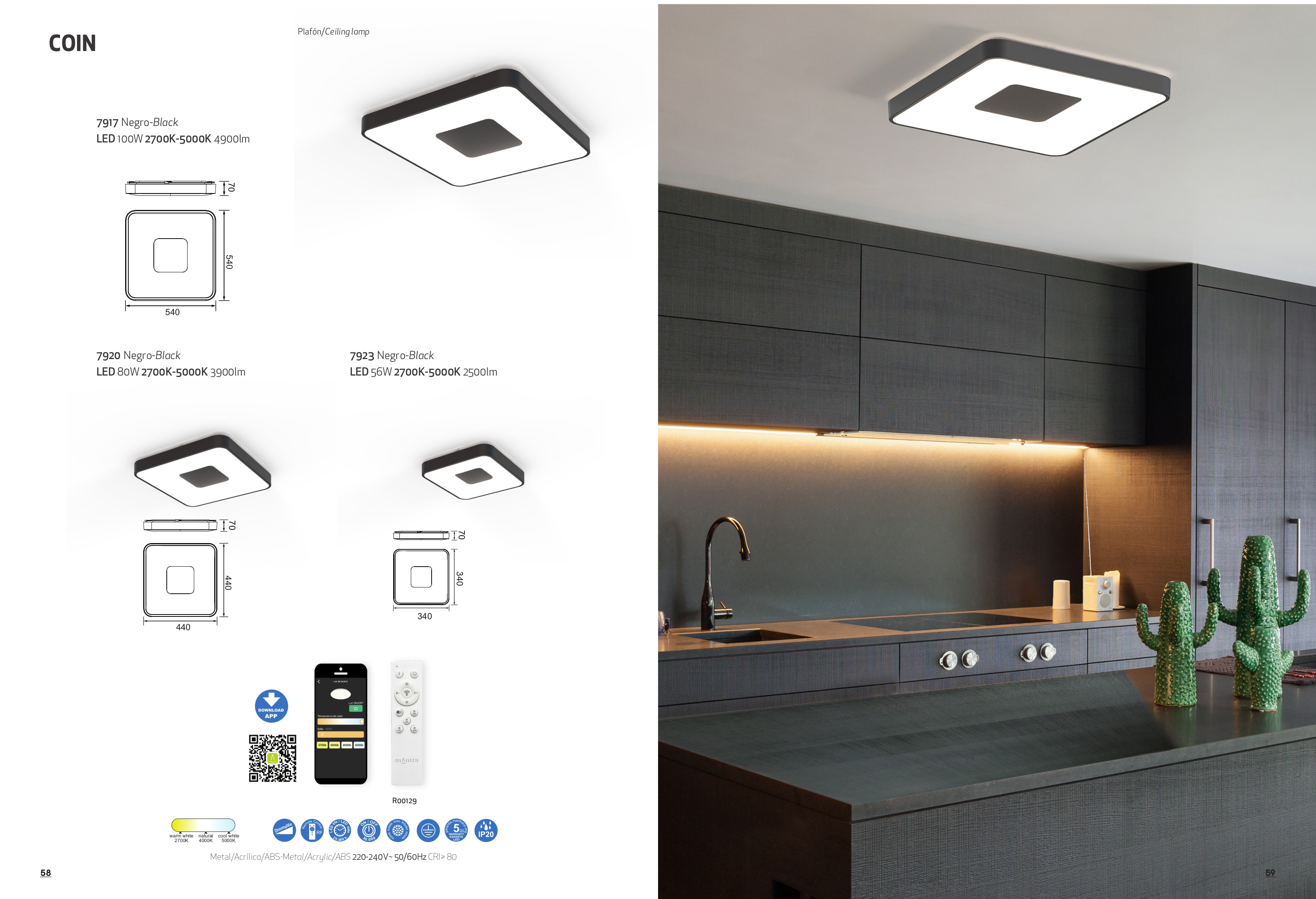 Лед плафон 7920 Black 80W 2700K-5000K 3900lm COIN CUADRADO ще осигури комфорт и естетика във всяко помещение, в което се постави. Цялостната визия и дизайн на led лампата и вложените в изработката й материали, като метал (ABS) в черен цвят, полимер в бяло, промяна на спектъра на светлината с дистанционно или приложение за смартфон, ще допринесат за един неповторим стил. Благодарение на дългогодишния опит в производството на лед осветление, качествените материали и строгия контрол на качеството на изработка на производителя Mantra (Испания), 7920 Black 80W 2700K-5000K 3900lm COIN CUADRADO е на високо европейско ниво.