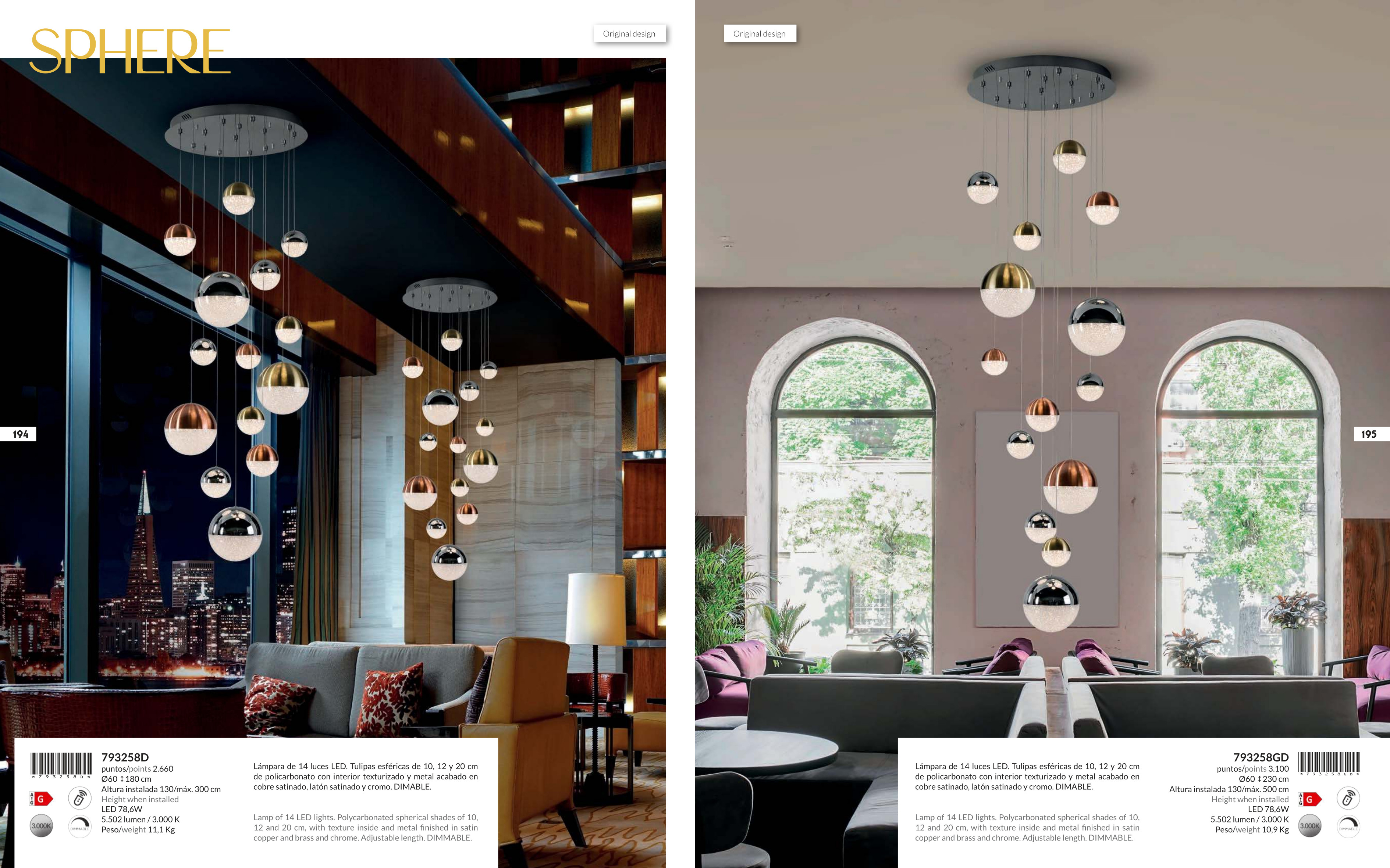 Осветителното тяло 793258GD ·SPHERE· LAMP 14L. ?60X500, DIMMABLE представлява лед полилей в съвременен стил. 793258GD ·SPHERE· LAMP 14L. ?60X500, DIMMABLE е от категорията и е подходящо за осветяване на различни помещения и пространства като: всекидневна / хол, спалня, трапезария, офис.