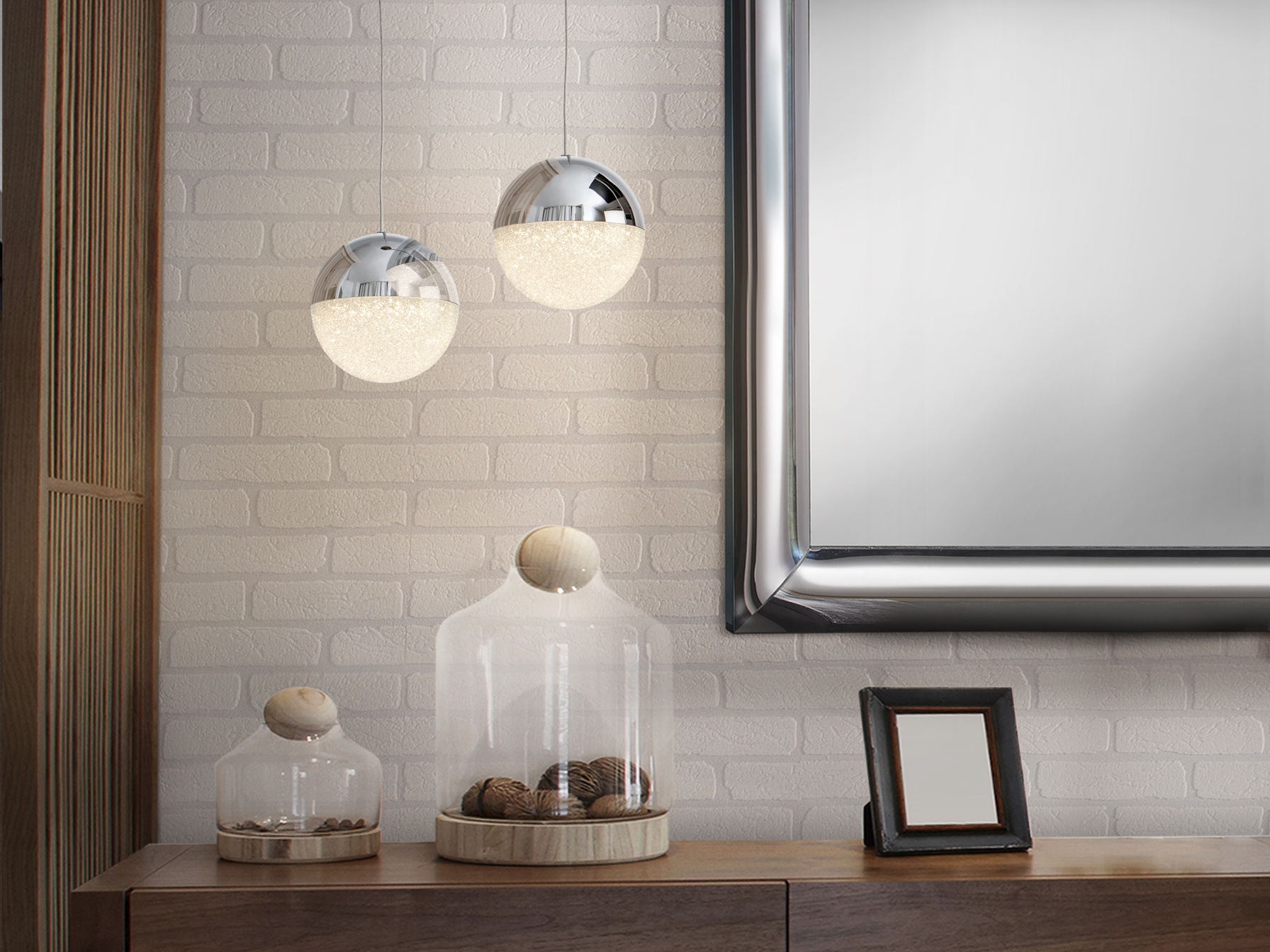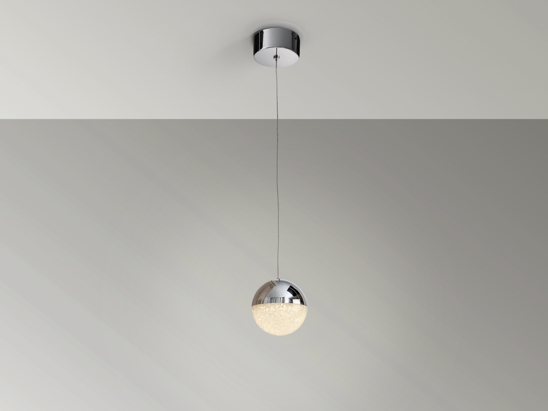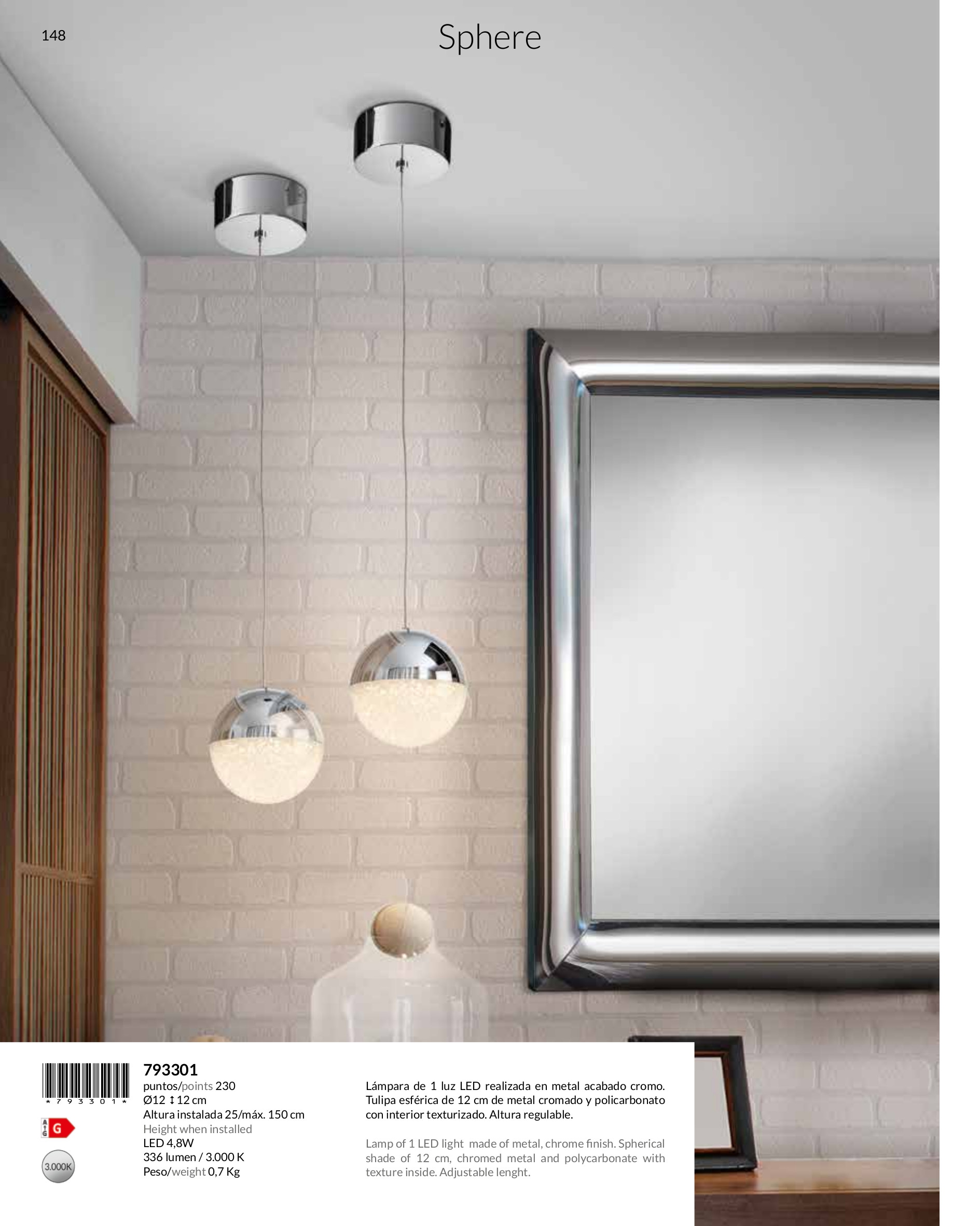 Осветителното тяло 793301LED SPHERE d12 H 120 Led 4.8W 3000K ще осигури комфорт и естетика във всяко помещение, в което се постави. Цялостната визия и дизайн на лампата и вложените в изработката й материали, като хромиран метал, сферичен дифузер от поликарбонат с текстурирана вътрешност, ще допринесат за един неповторим стил. Благодарение на дългогодишния опит, качествените материали и строгия контрол на качеството на изработка на производителя Schuller (Испания), 793301LED SPHERE d12 H 120 Led 4.8W 3000K е на високо европейско ниво.
