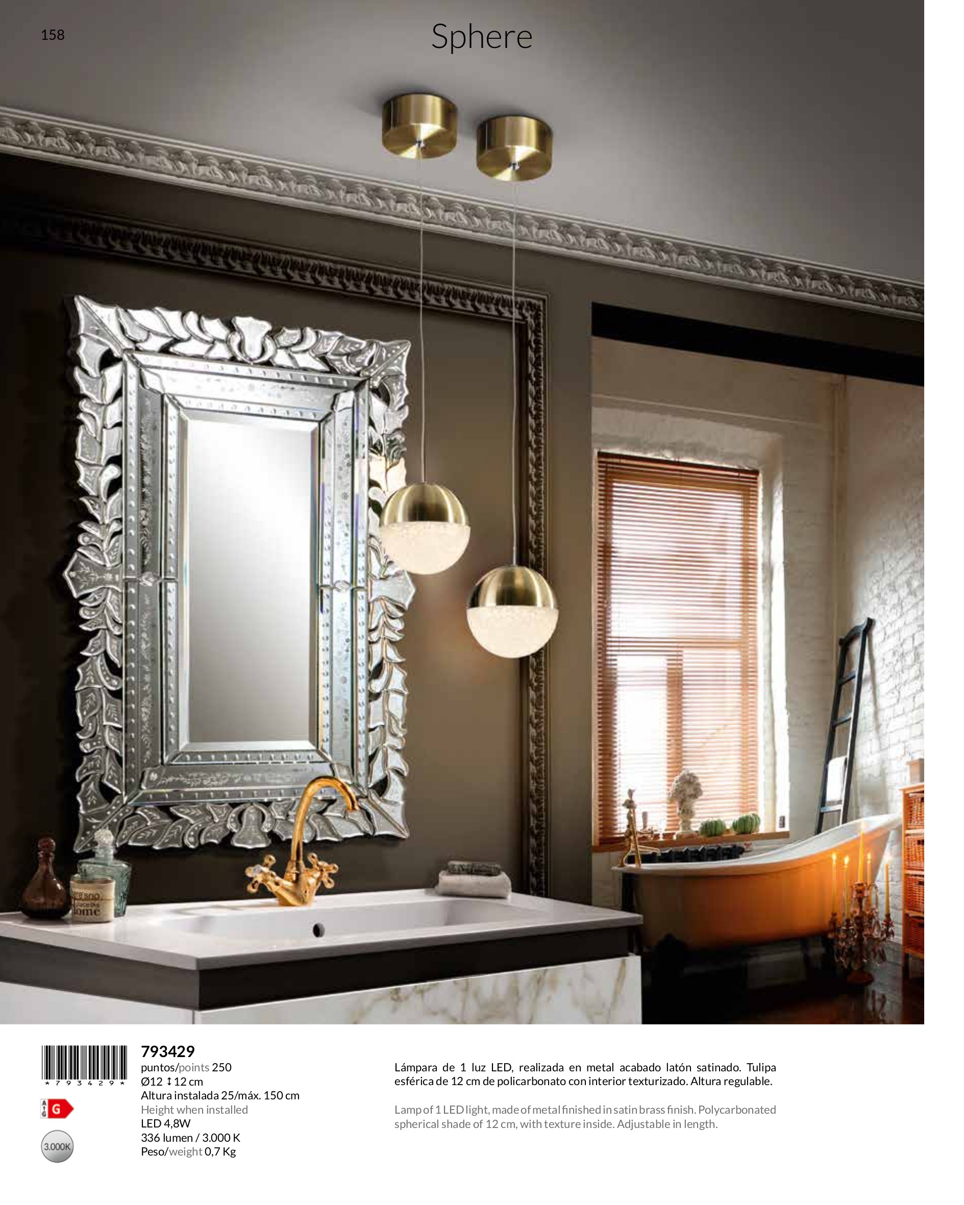 Осветителното тяло 793429 Sphere D12 H 120 4.8W 3000K ще осигури комфорт и естетика във всяко помещение, в което се постави. Цялостната визия и дизайн на лампата и вложените в изработката й материали, като метал с покритие от сатениран месинг, поликарбонатен сферичен дифузер с текстура отвътре, в горната си част изработен от метал в цвят полиран месинг, ще допринесат за един неповторим стил. Благодарение на дългогодишния опит, качествените материали и строгия контрол на качеството на изработка на производителя Schuller (Испания), 793429 Sphere D12 H 120 4.8W 3000K е на високо европейско ниво.