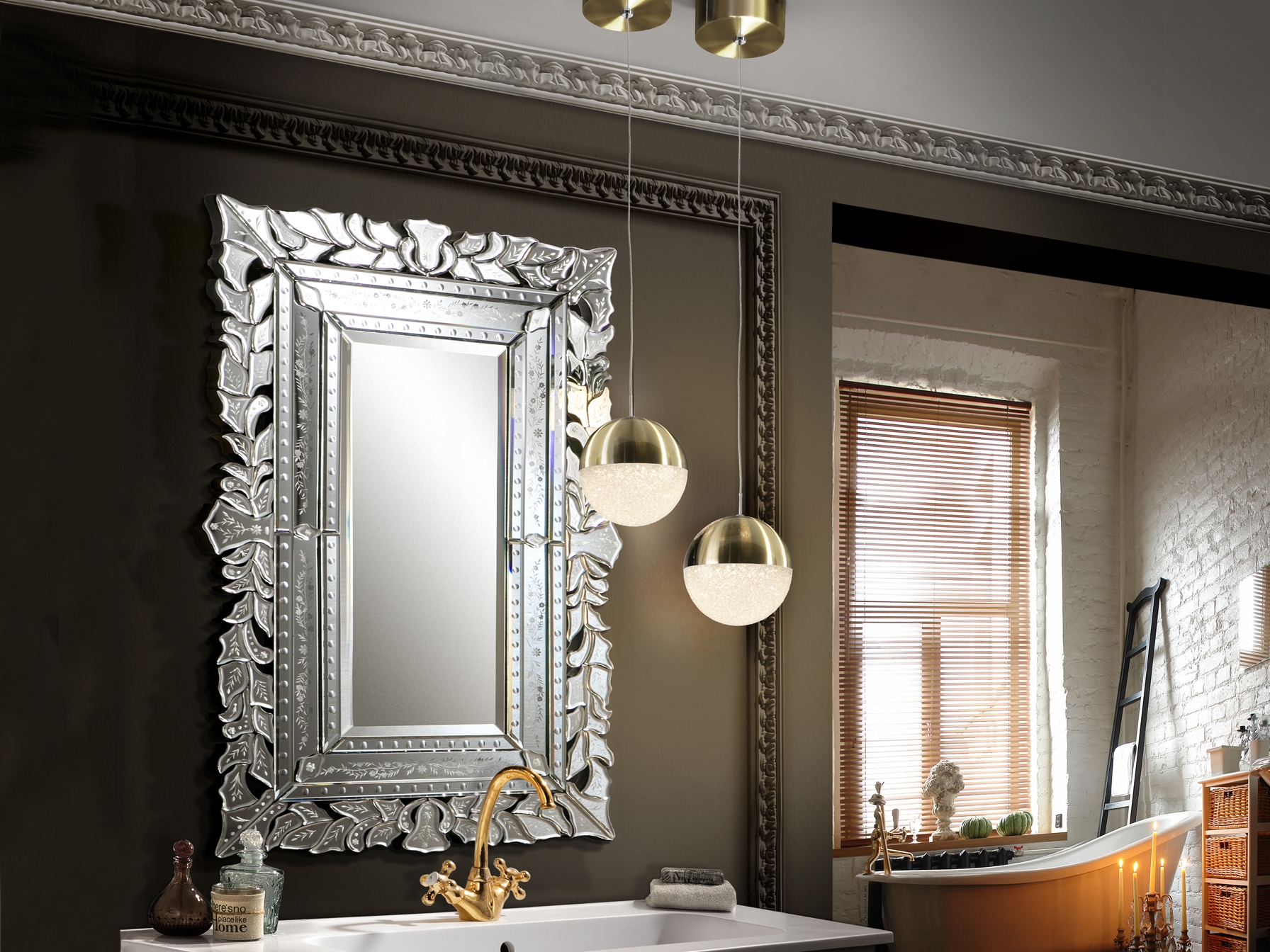 метал с покритие от сатениран месинг, поликарбонатен сферичен дифузер с текстура отвътре, в горната си част изработен от метал в цвят полиран месинг