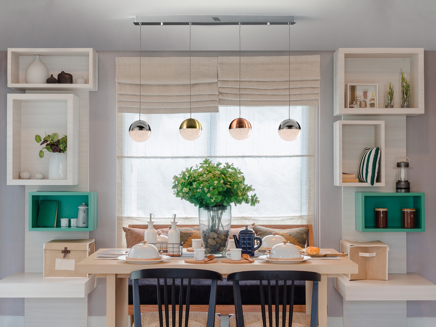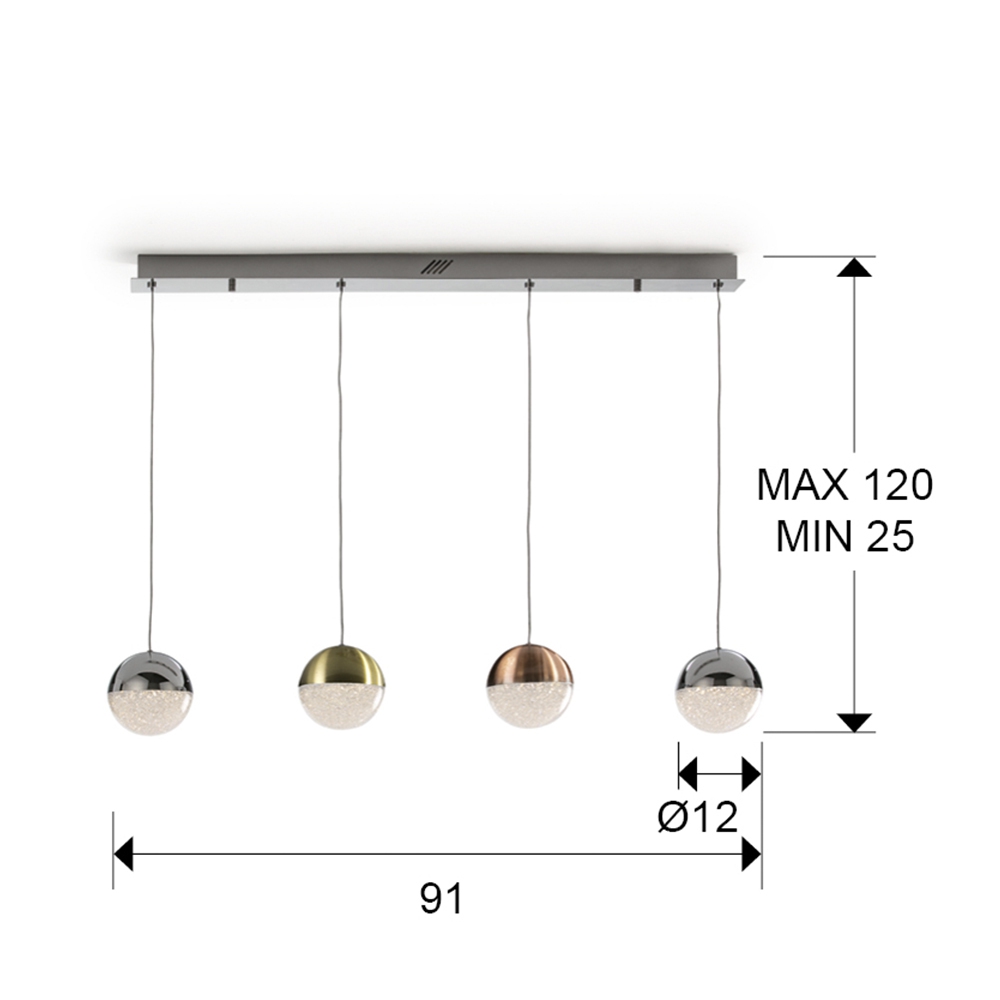 хромиран метал, сферични осветителни тела от поликарбонат с текстура отвътре и метал с покритие от сатенирана мед, сатениран месинг и хром