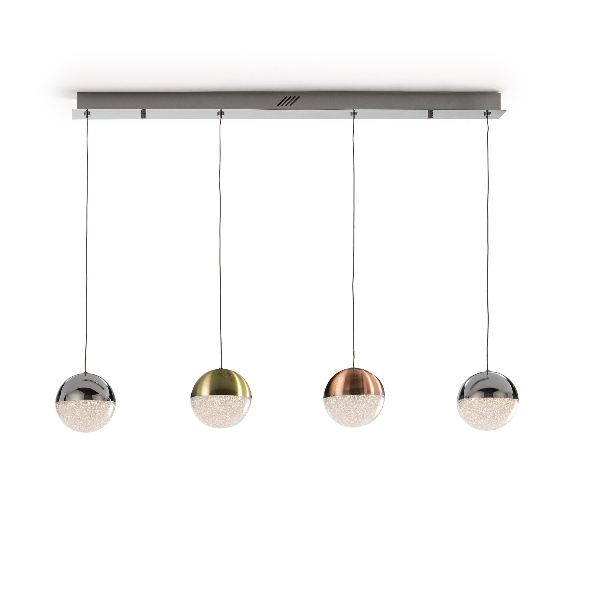 хромиран метал, сферични осветителни тела от поликарбонат с текстура отвътре и метал с покритие от сатенирана мед, сатениран месинг и хром, димиране чрез BLUETOOTH с APP за смартфон
