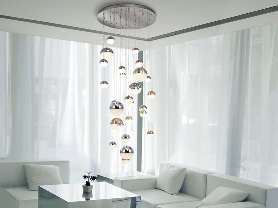 хромиран метал, сферични осветителни тела от поликарбонат с текстура отвътре и метал с покритие от сатенирана мед, сатениран месинг и хром, димиране и смяна на цветната температура чрез BLUETOOTH с APP за смартфон
