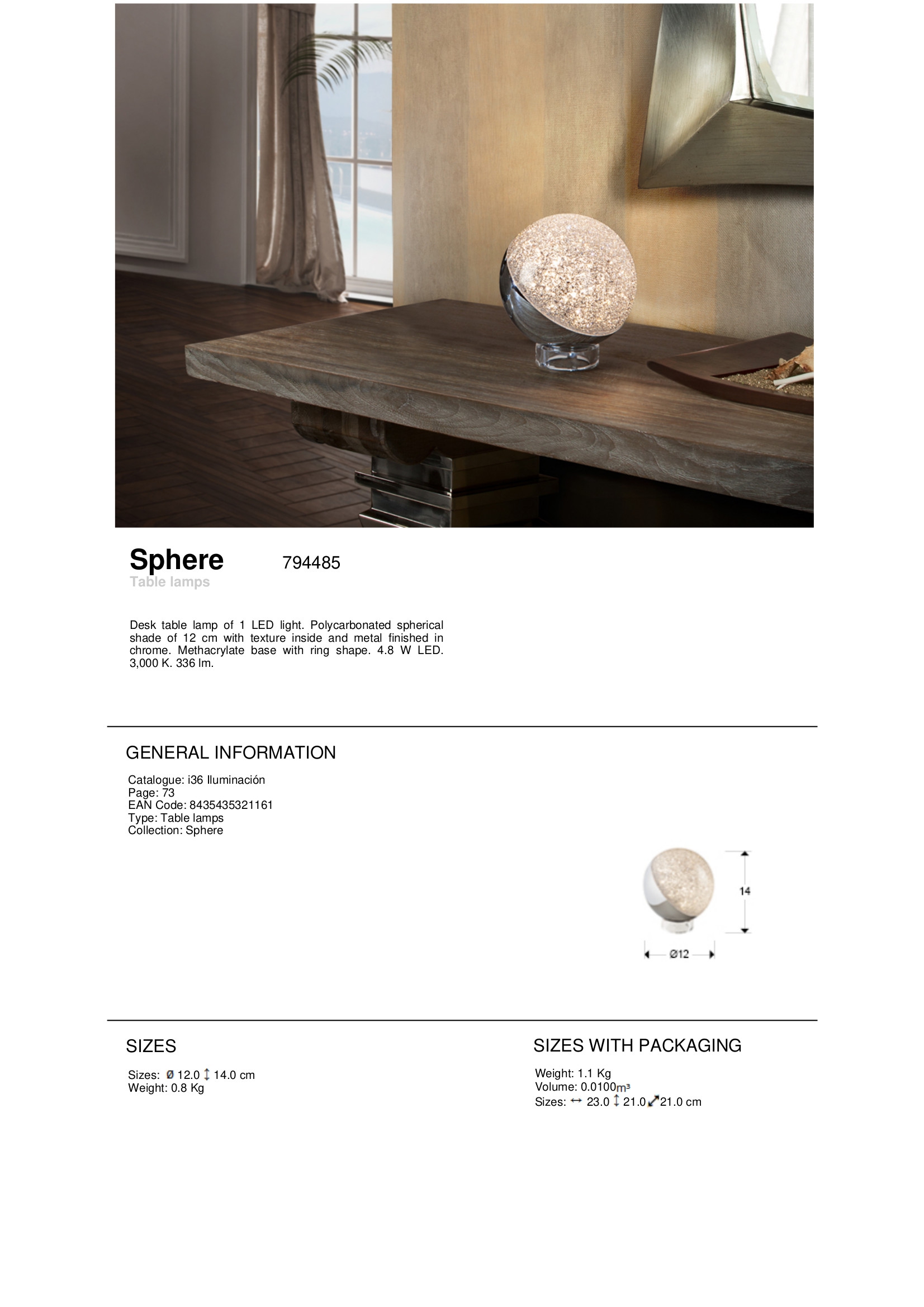 Осветителното тяло 794485 SPHERE TABLE LAMP 1L LED ?12 ще осигури комфорт и естетика във всяко помещение, в което се постави. Цялостната визия и дизайн на лампата и вложените в изработката й материали, като хромиран метал, сферичен дифузер от поликарбонат с текстурирана вътрешност, основа от прозрачен метакрилат, ще допринесат за един неповторим стил. Благодарение на дългогодишния опит, качествените материали и строгия контрол на качеството на изработка на производителя Schuller (Испания), 794485 SPHERE TABLE LAMP 1L LED ?12 е на високо европейско ниво.