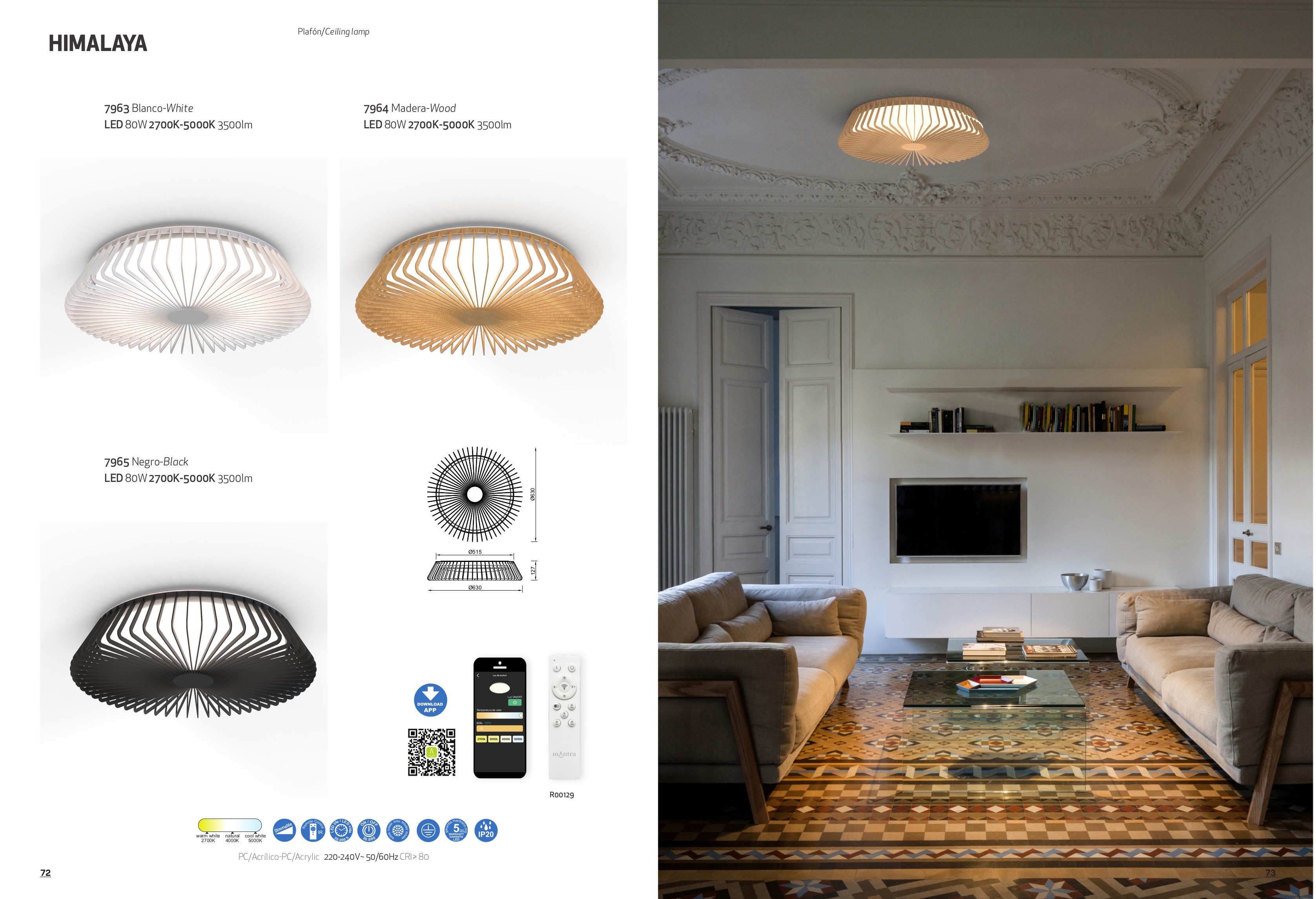 Лед плафон 7965 Black 80W 2700K-5000K 3500lm HIMALAYA CEILING ще осигури комфорт и естетика във всяко помещение, в което се постави. Цялостната визия и дизайн на led лампата и вложените в изработката й материали, като полимер в черен цвят, дифузер от акрил в бяло, управление с дистанционно или приложение за смартфон, ще допринесат за един неповторим стил. Благодарение на дългогодишния опит в производството на лед осветление, качествените материали и строгия контрол на качеството на изработка на производителя Mantra (Испания), 7965 Black 80W 2700K-5000K 3500lm HIMALAYA CEILING е на високо европейско ниво.