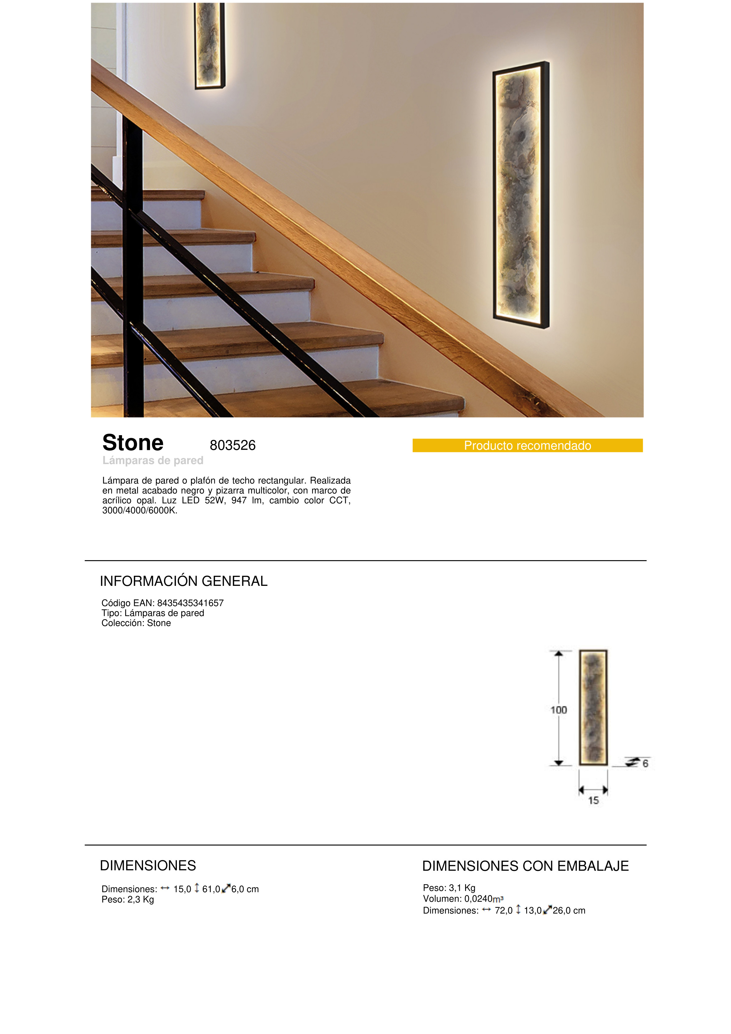 Осветителното тяло 803526 STONE- WALL LAMP LED CCT-BLACK L60 ще осигури комфорт и естетика във всяко помещение, в което се постави. Цялостната визия и дизайн на лампата и вложените в изработката й материали, като метал в черен цвят, полупрозрачен дифузьор в цвят шисти, контур от акрил в цвят бял опал, ССТ 3000/4000/6000K, ще допринесат за един неповторим стил. Благодарение на дългогодишния опит, качествените материали и строгия контрол на качеството на изработка на производителя Schuller (Испания), 803526 STONE- WALL LAMP LED CCT-BLACK L60 е на високо европейско ниво.
