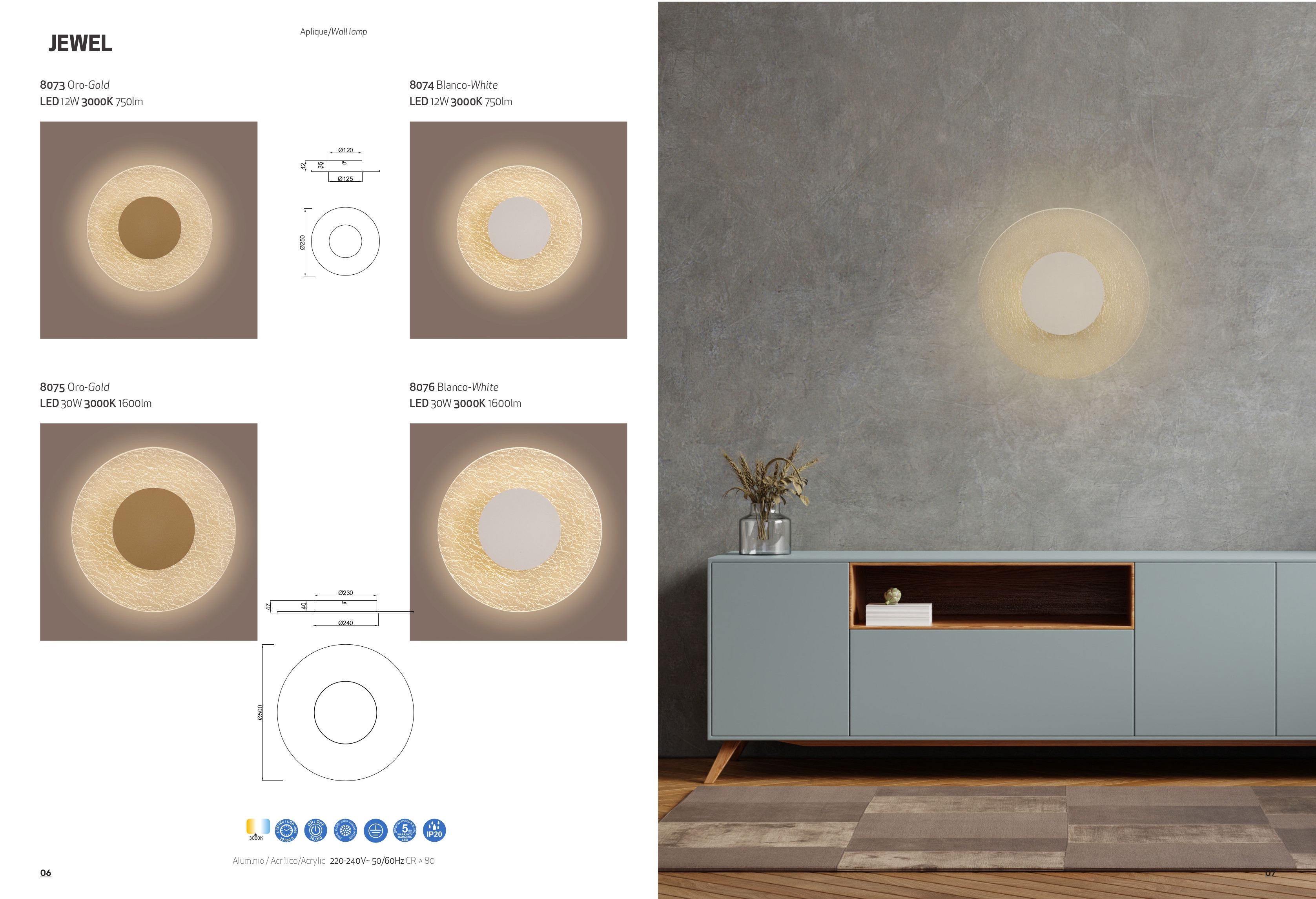 Лед аплик 8076 White 30W 3000K 1600lm JEWEL ще осигури комфорт и естетика във всяко помещение, в което се постави. Цялостната визия и дизайн на led лампата и вложените в изработката й материали, като алуминий в бял цвят, полимер в златисто, ще допринесат за един неповторим стил. Благодарение на дългогодишния опит в производството на лед осветление, качествените материали и строгия контрол на качеството на изработка на производителя Mantra (Испания), 8076 White 30W 3000K 1600lm JEWEL е на високо европейско ниво.